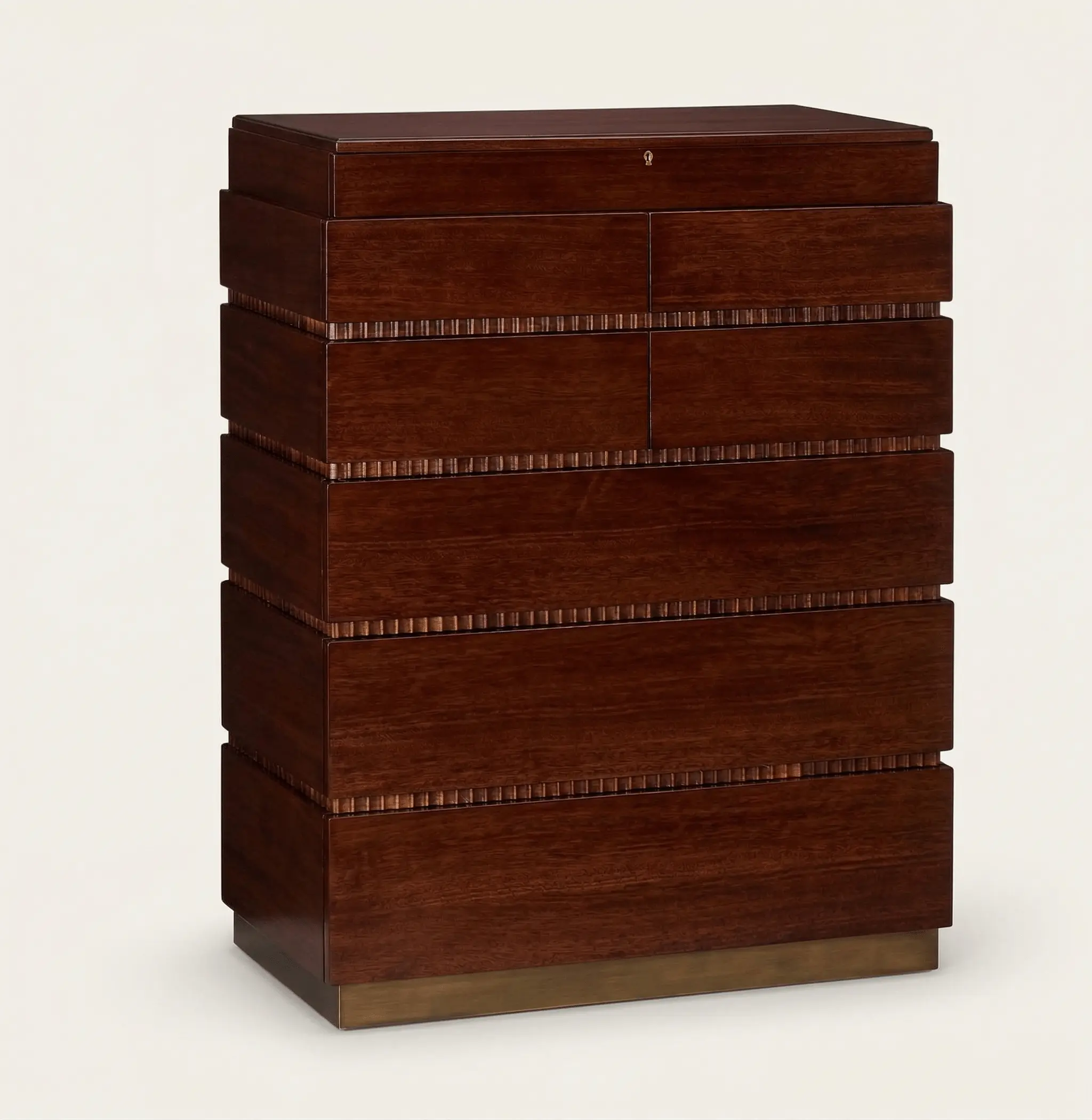 Fluted detailing · Structured interior compartments · Brass plinth base · Solid mahogany