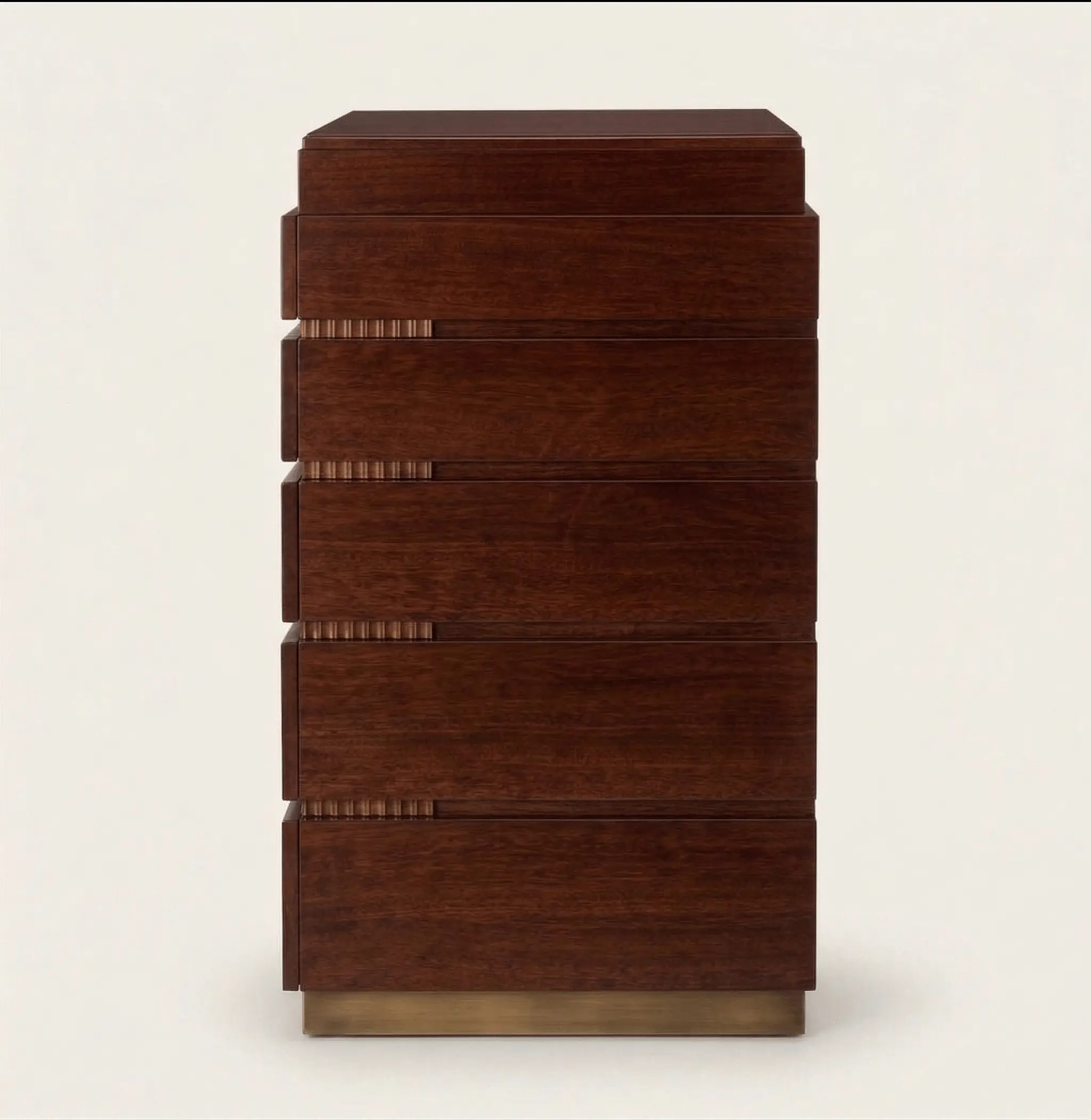 Inside, the compartments are structured for what is kept, not accumulated — watches, writing instruments, and daily essentials. A brass plinth base grounds the piece, adding weight and quiet definition. The result is a mahogany campaign chest designed for dressing areas, studies, and private spaces where order is intentional.