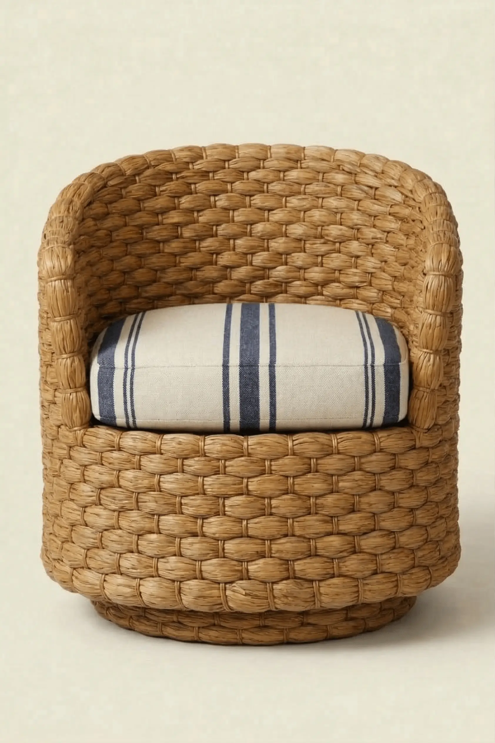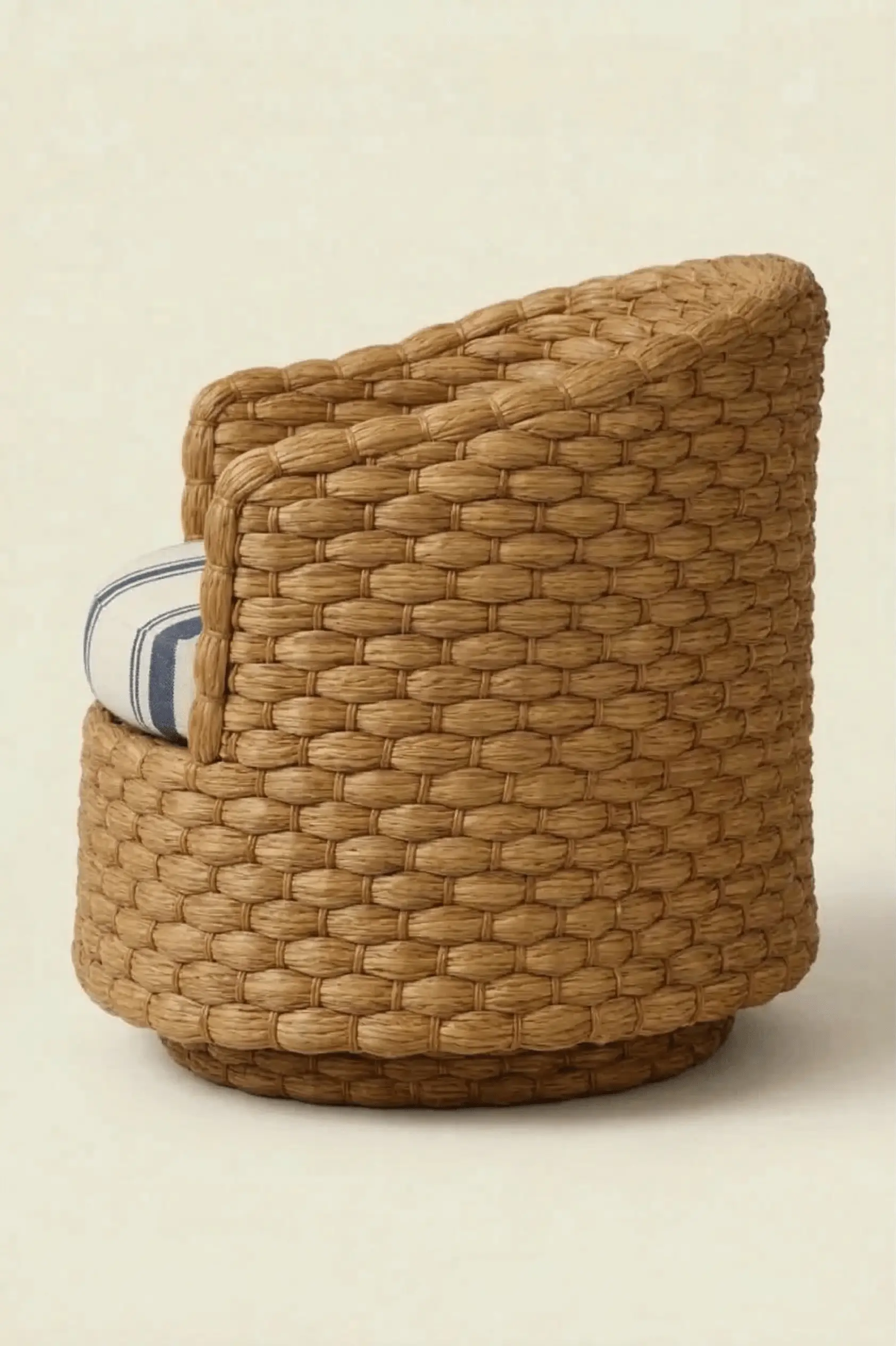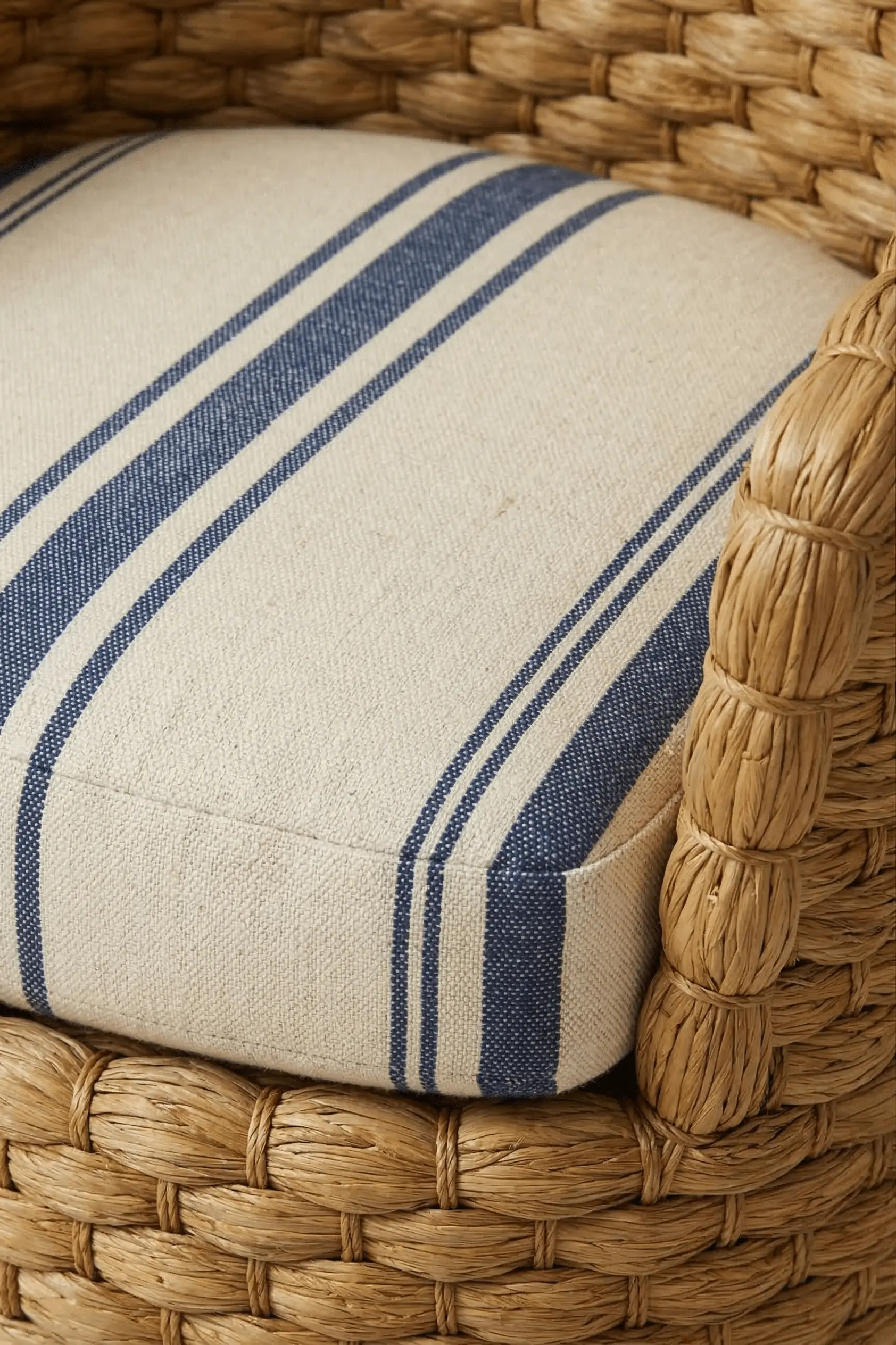 A tailored upholstered cushion provides comfort while allowing the woven structure to remain the visual centerpiece of the piece. The balanced proportions and rounded form allow the chair to function comfortably in both relaxed and refined interiors, from sunrooms and verandas to living rooms and casual seating areas where natural materials help soften the room’s overall composition.