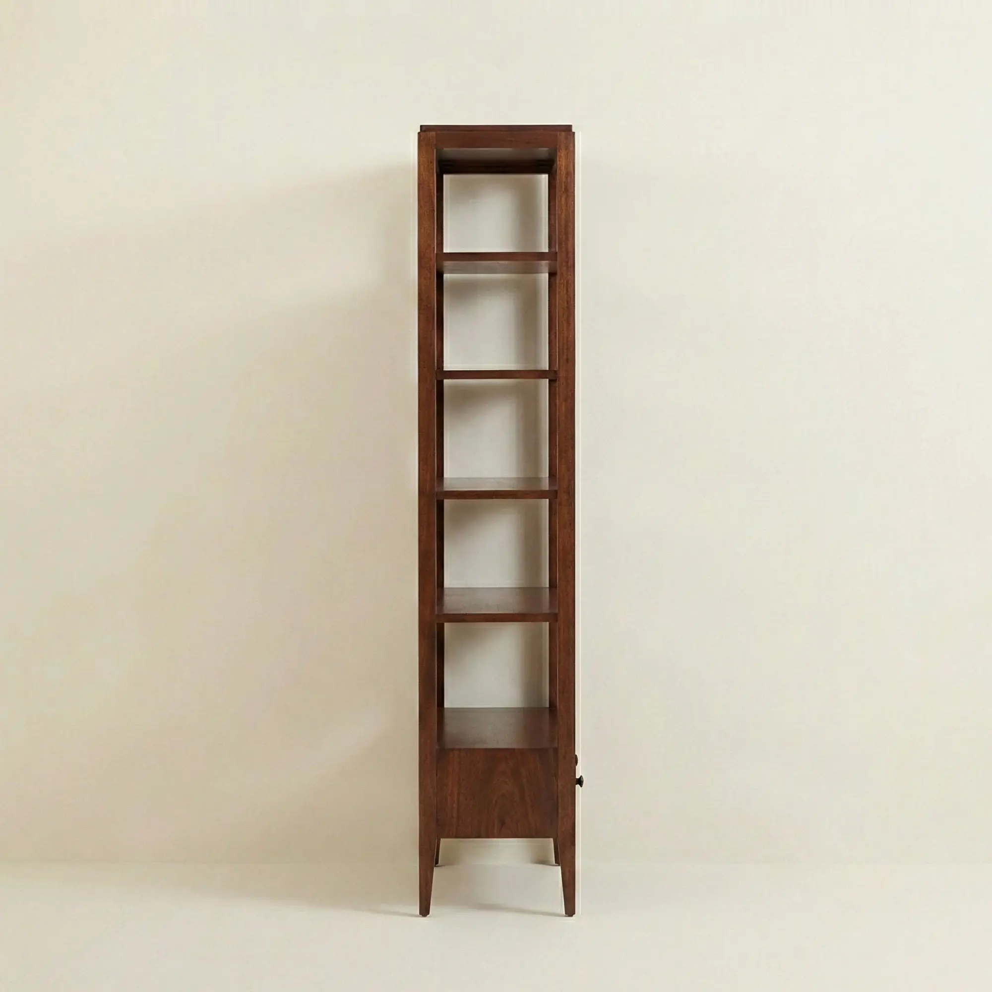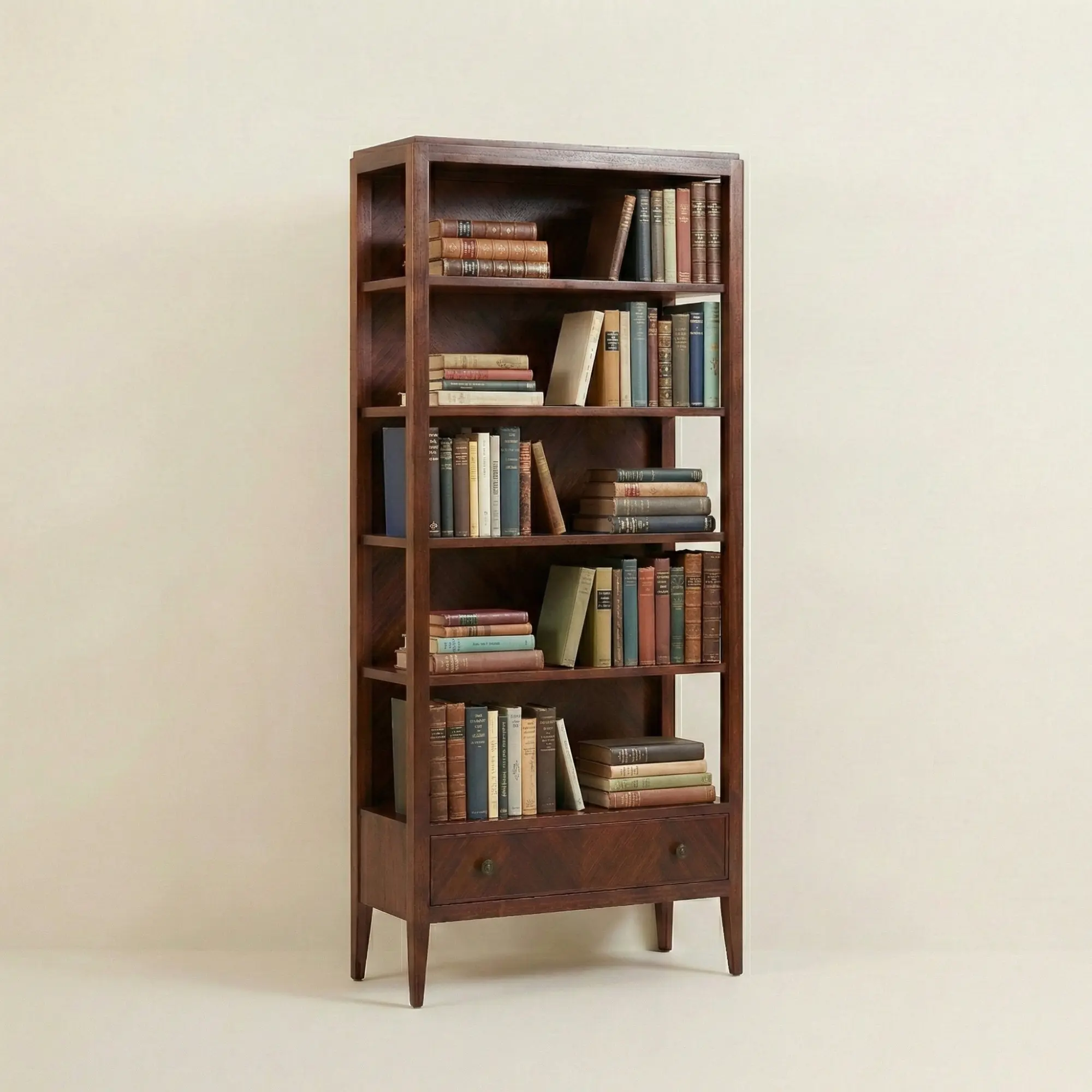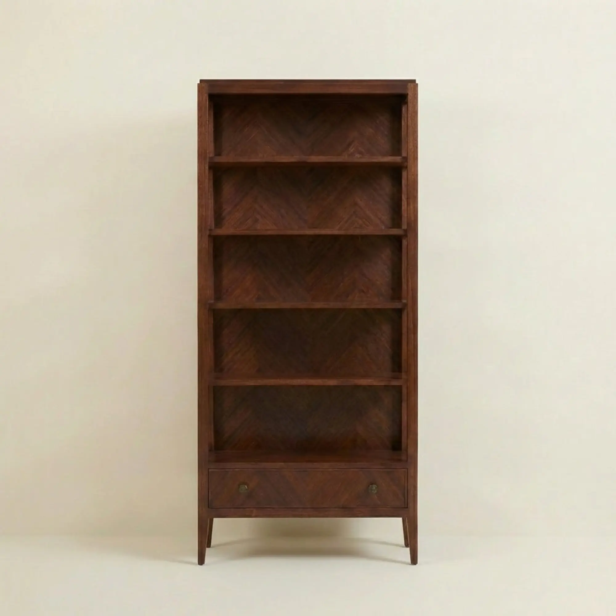 Designed with the quiet authority of a traditional library piece, the Ashford Herringbone Bookcase brings architectural balance and warmth to interiors that favor proportion and permanence. Crafted in rich mahogany, its tall, slender profile offers presence without excess, standing elevated on tapered legs that lend the piece a lighter, more refined stance.