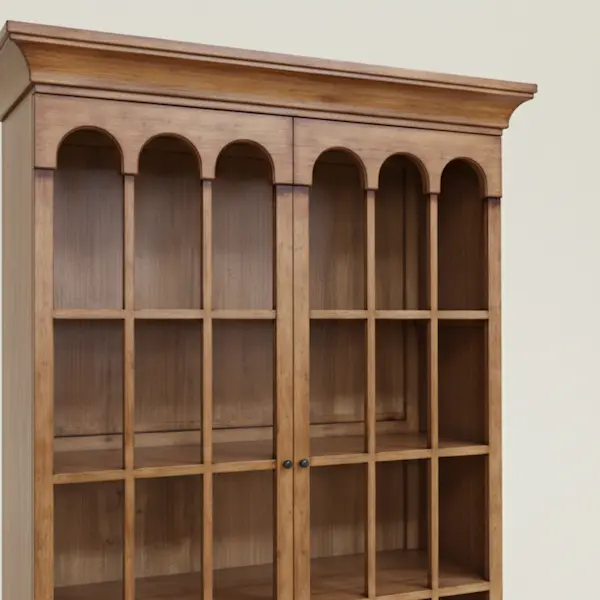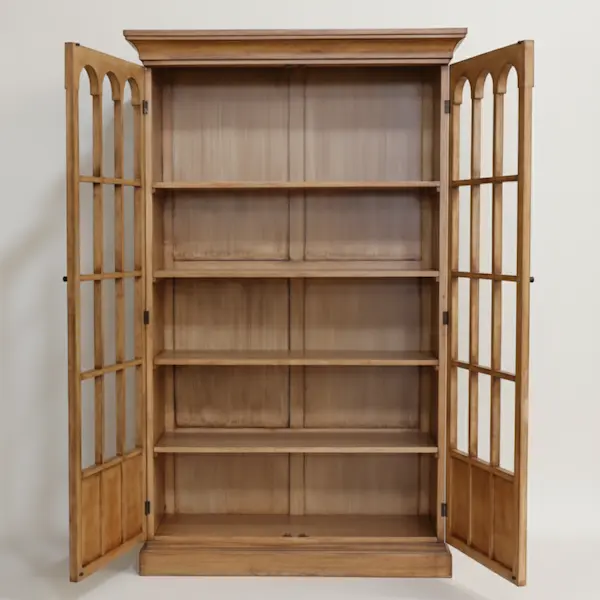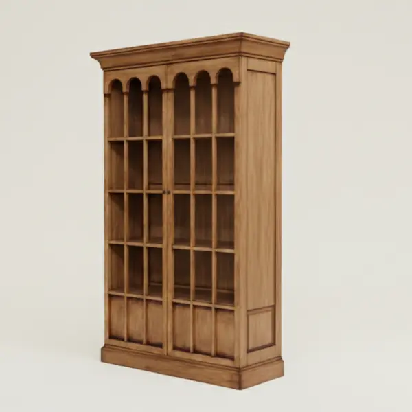 Inspired by grand townhouse libraries, the Belgravia Arched Library Bookcase is crafted from solid mahogany and finished in a warm antique brown that reveals the depth of the grain. Tall arched frieze moldings crown a pair of glazed doors with finely divided mullions, creating a classic gallery for books, objets d’art, and collected treasures.