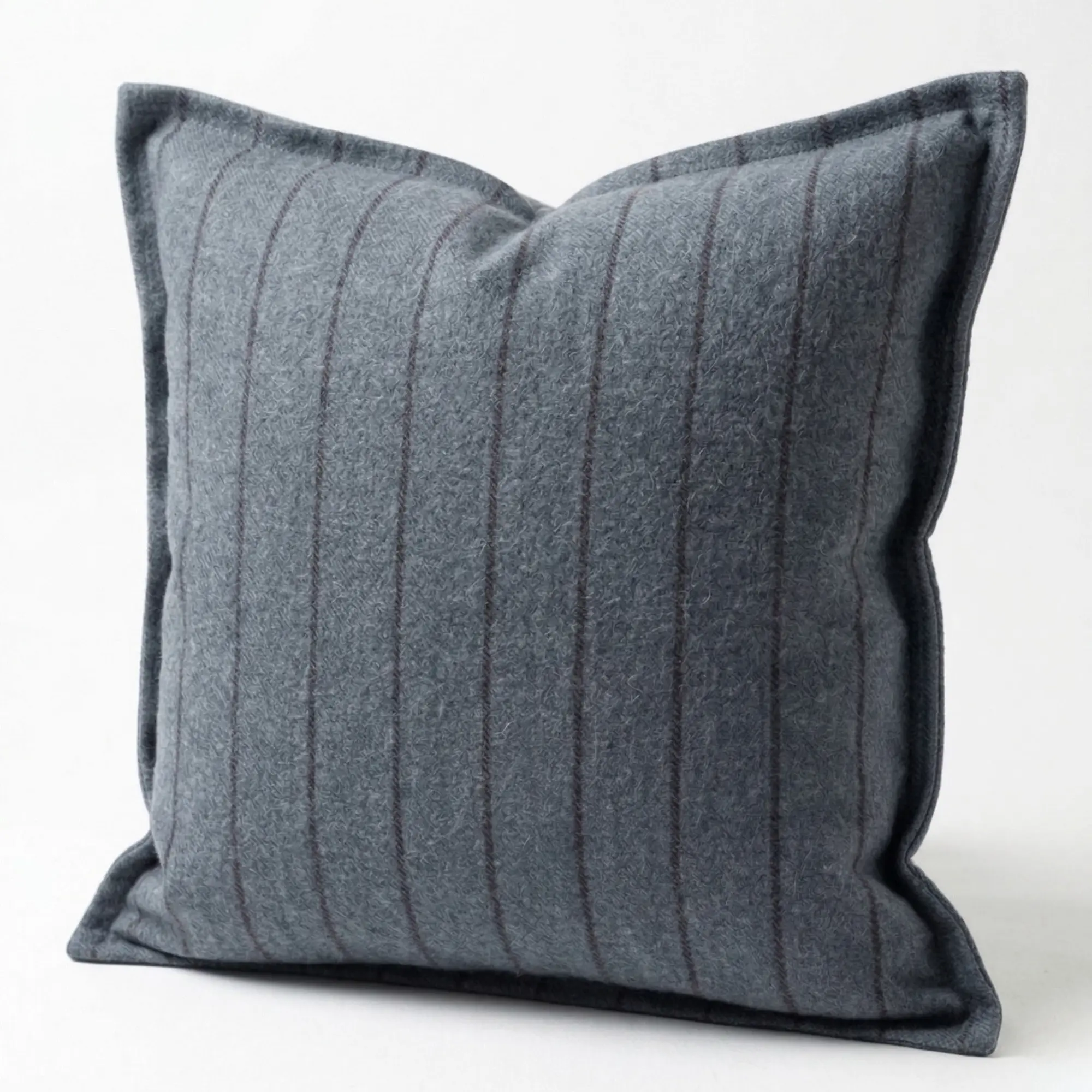 The Bromley Stripe Throw Pillow pairs a gray brushed cotton herringbone front with a charcoal pinstripe reverse, creating a quiet interplay of texture and pattern. The effect is tailored rather than decorative, bringing structure without visual excess.