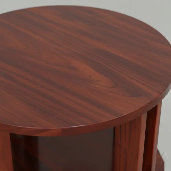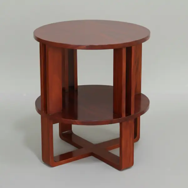 Crafted in a rich mahogany finish, the Carlton Library Table is a sculptural two-tier round table designed to feel collected and enduring. A hand-applied sheen highlights the depth of the wood, while the turned pedestal and cross-braced base give the piece architectural presence and balance. The smooth circular top and lower shelf offer an elegant surface for books, framed photographs, or curated objects.
