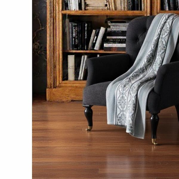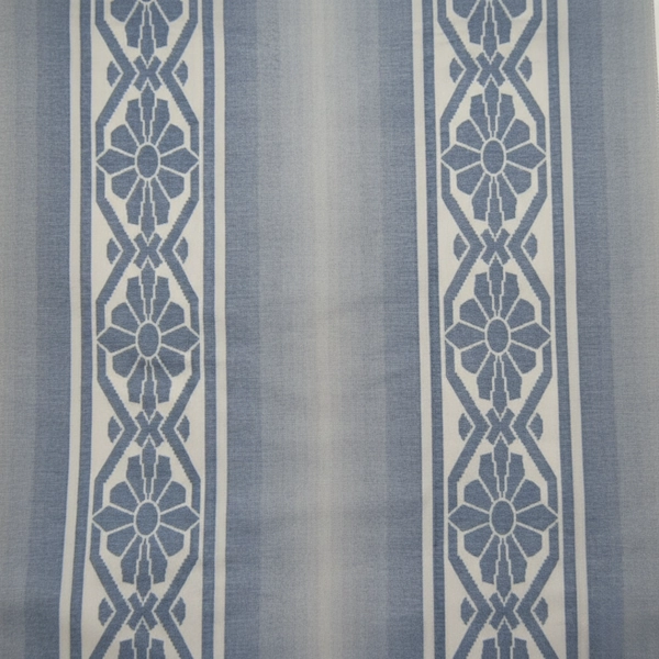 A central panel of gradient gray is framed by slate blue and ivory bands in a timeless geometric lattice motif, finished with a crisp four-sided hem. Versatile and elegant, it adds quiet luxury to any setting—drape it over a leather armchair for heritage character, layer it with ivory linens for coastal ease, or pair it with dark wood furnishings to highlight its classic design.