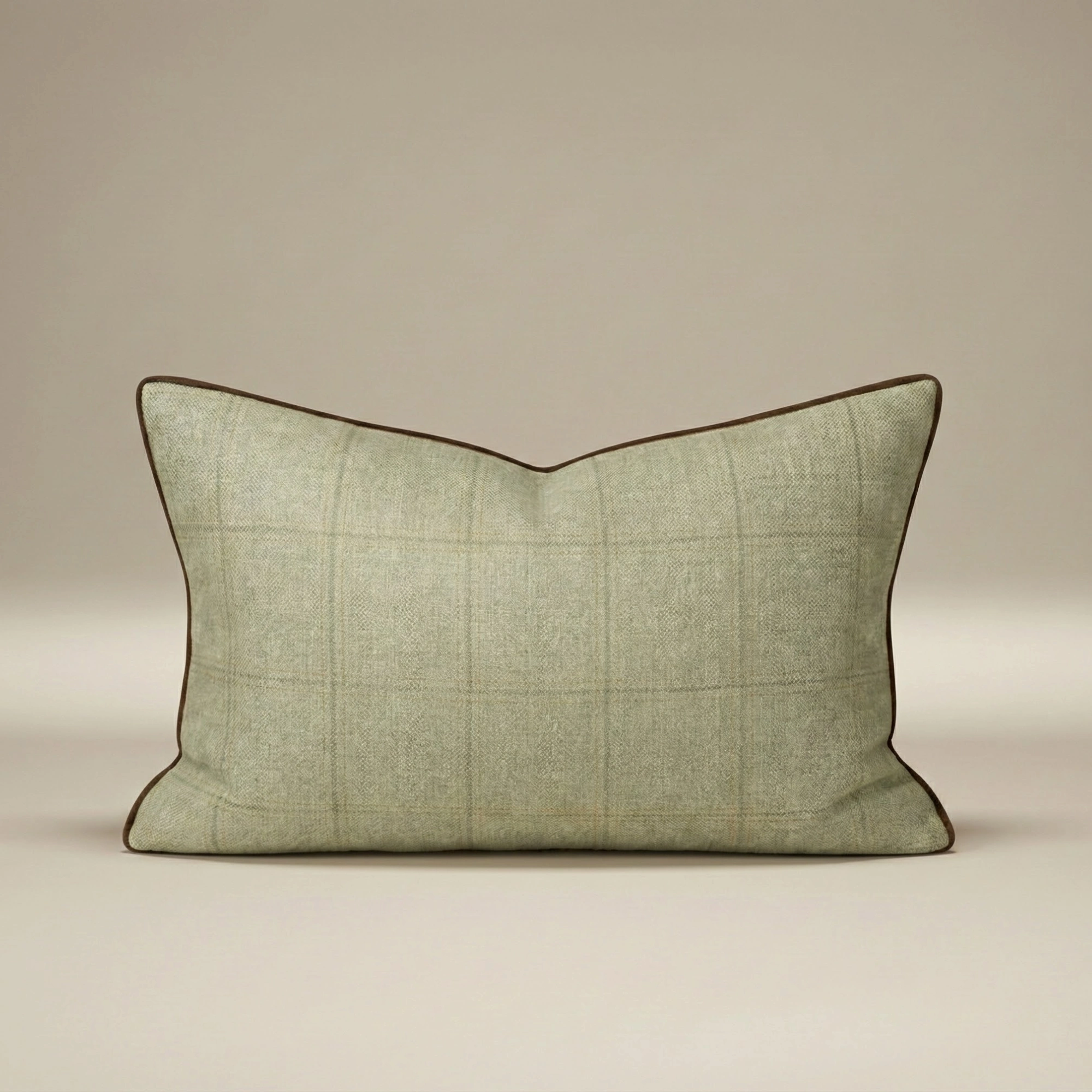 Tailored and quietly confident, the Glenwick Windowpane Throw Pillow brings a menswear-inspired check to interiors with calm restraint. Woven in a softened sage ground with a subtle windowpane grid, it reads like a collected textile rather than a decorative statement. Dark piping sharpens the edges for a finished, architectural look, making it an easy layer for caned seating, benches, and composed lounge arrangements.