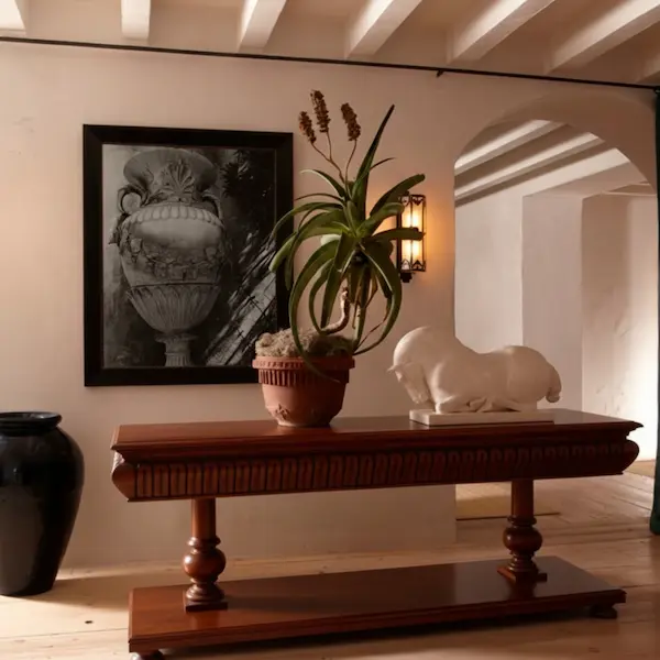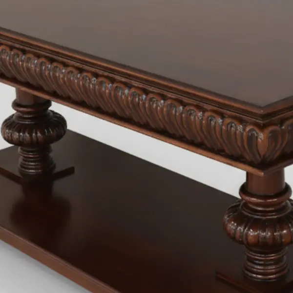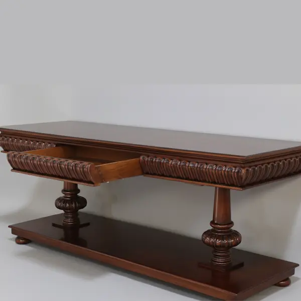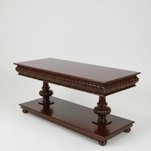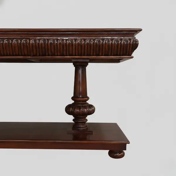 A study in architectural elegance, the Harrington Console Table is defined by its deeply hand-carved apron, turned pedestal supports, and generous mahogany surface. Each element is sculpted with the richness and permanence of traditional craftsmanship.