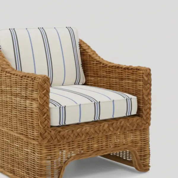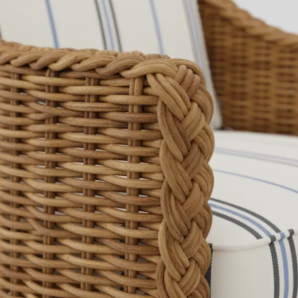 Handwoven from richly textured natural wicker, the Westport Wicker Lounge Chair embodies relaxed sophistication and enduring comfort. Its sculpted barrel silhouette and braided trim detailing reflect heritage craftsmanship, while the natural finish lends a warm, organic texture to any interior.