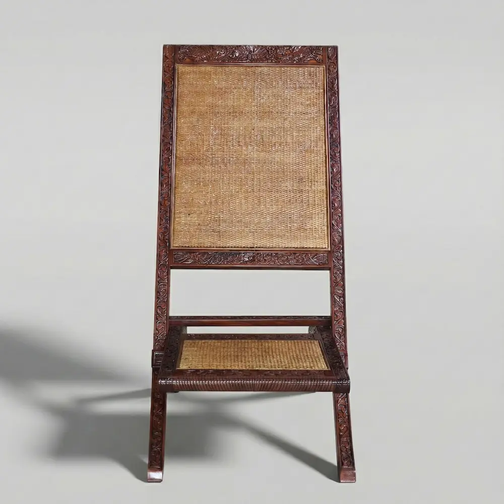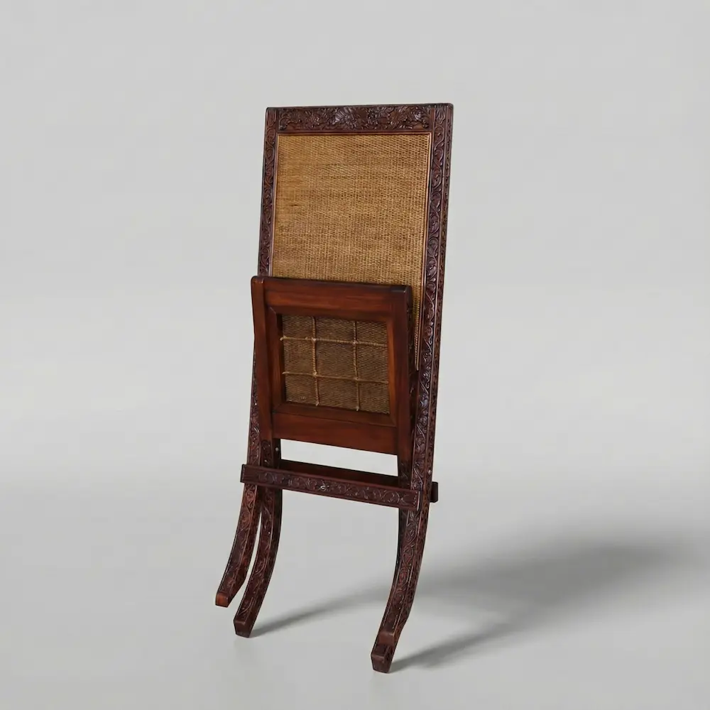 The seat and back are woven in natural cane, offering breathable comfort and a quiet textural contrast to the carved frame. Designed in the tradition of classic campaign furniture, the chair features a folding construction that balances practicality with elegance, originally intended for ease of movement without sacrificing form.