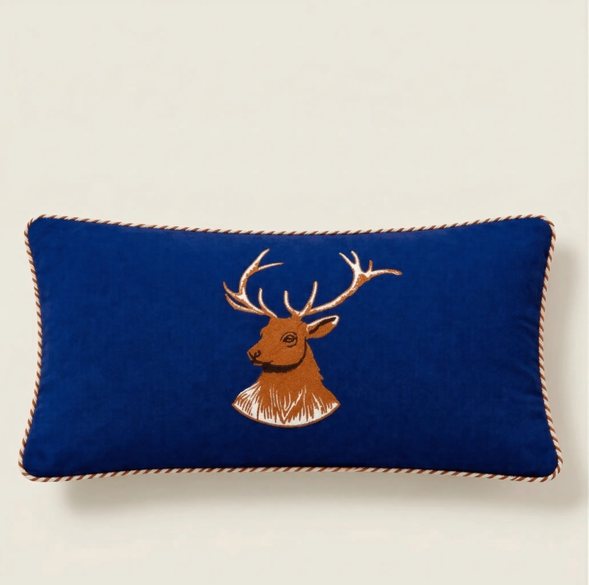 The Highland Stag Lumbar Throw Pillow is defined by a finely embroidered stag motif set against a deep navy ground. The composition draws from traditional sporting iconography, introducing a sense of quiet heritage and structure without excess ornament.