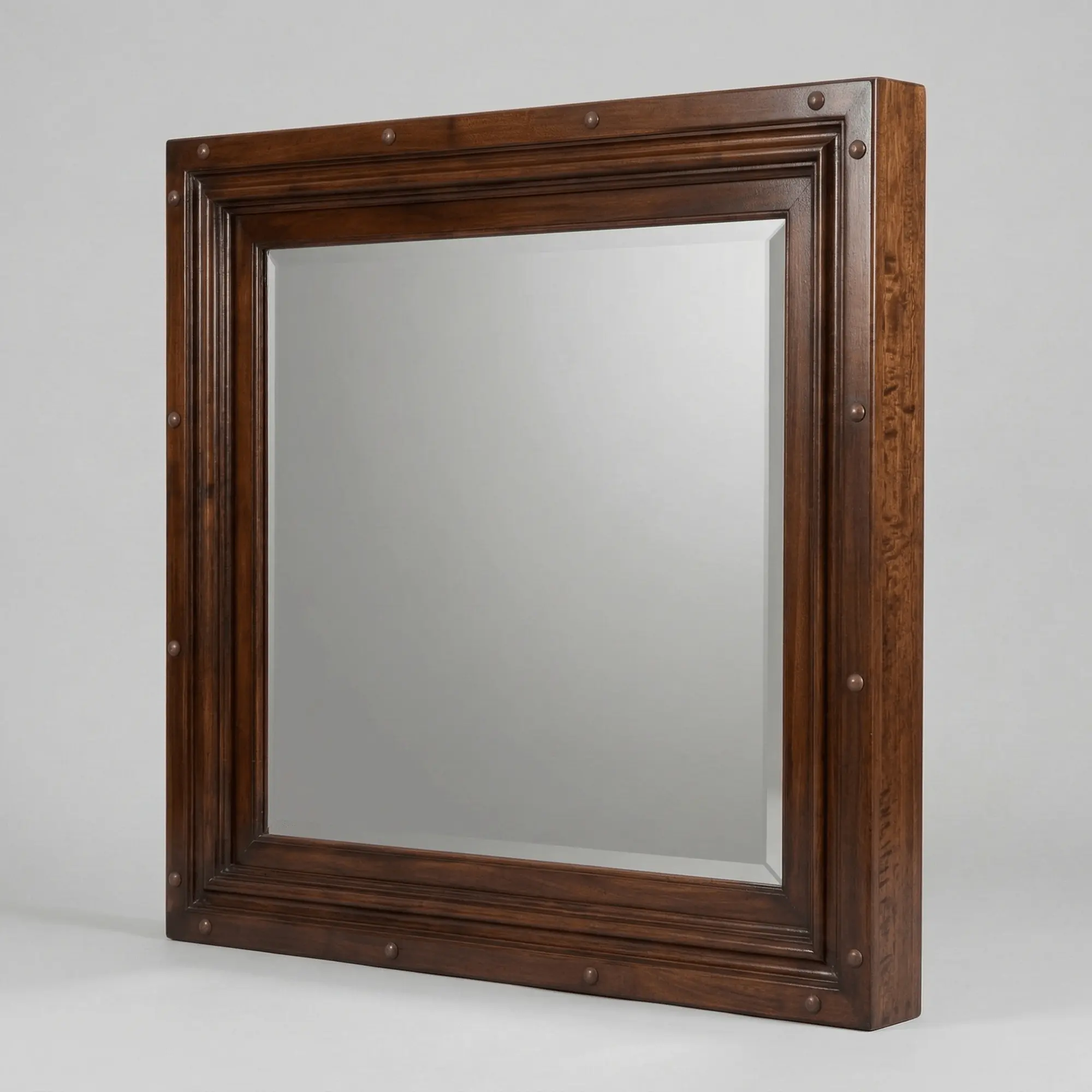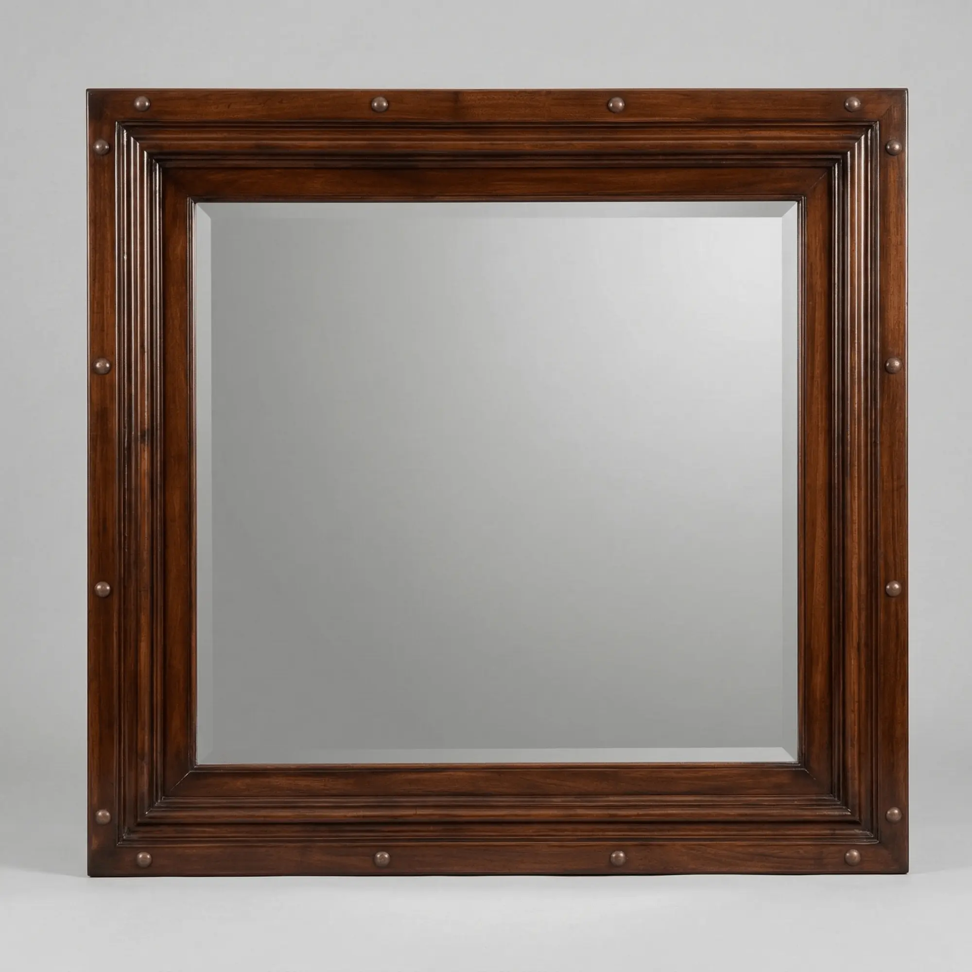 Solid mahogany · Hand-rubbed finish · Forged nail-head accents · Square architectural frame