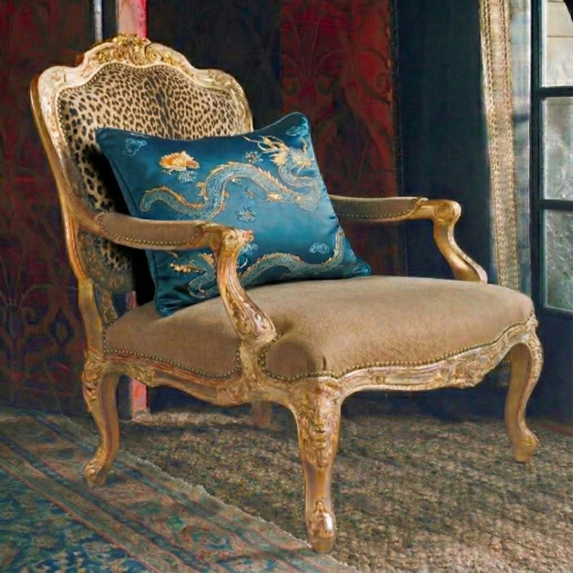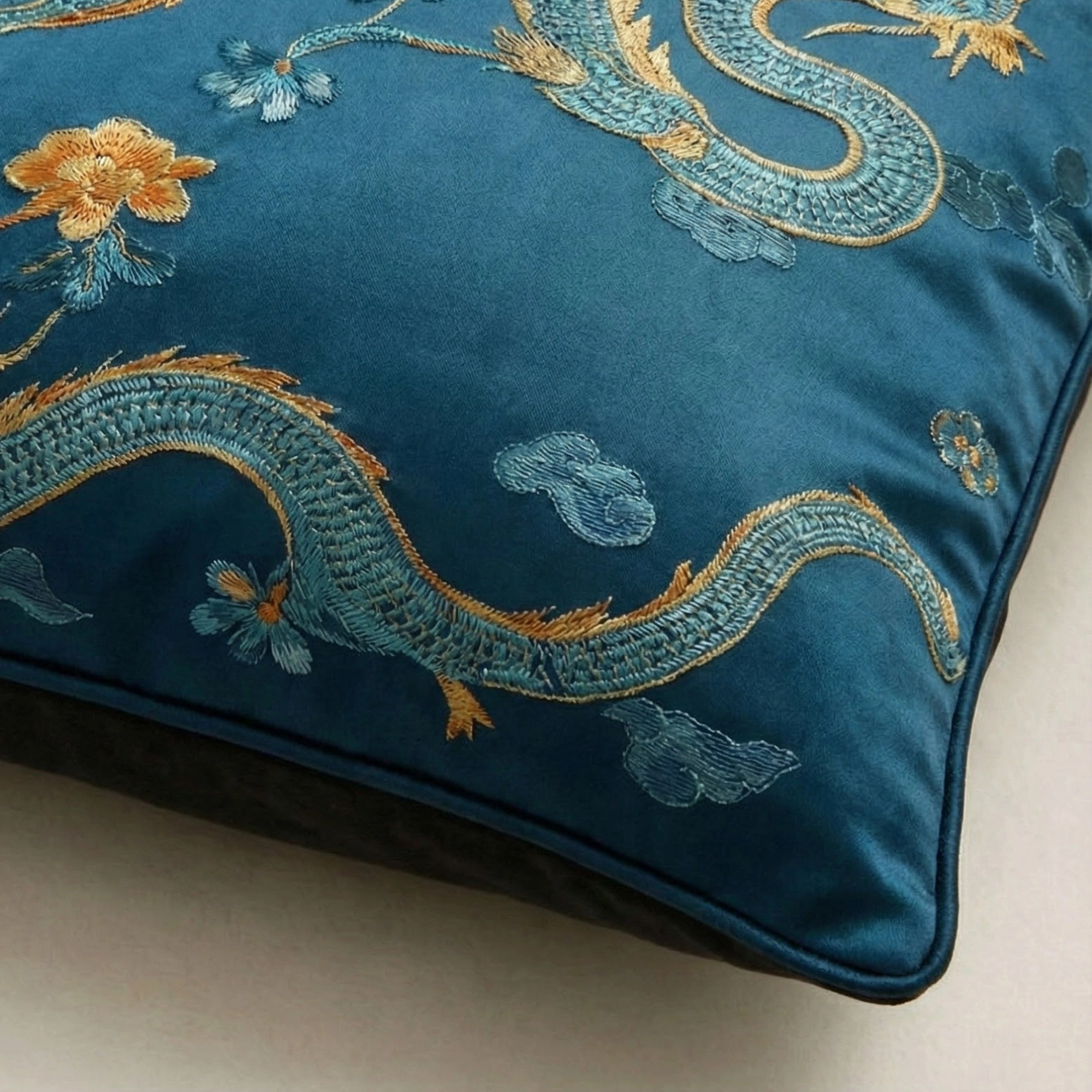 Timeless authority meets artisanal detail. The Julian Throw Pillow defines the room without dominating it. Crafted from a lustrous, deep teal silk-blend, the face features intricate chinoiserie-inspired embroidery, rendering a mythical motif in subtle metallic threads that catch the light with understated elegance.
