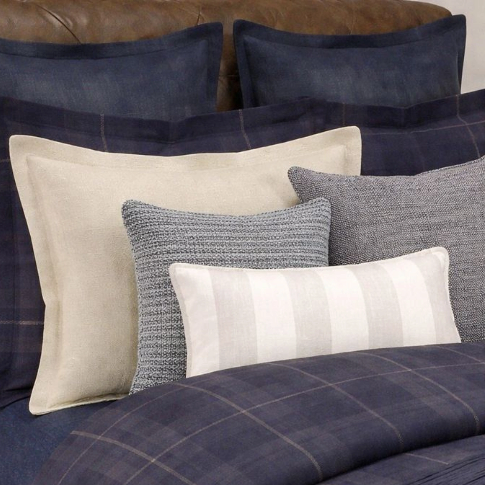 Designed for effortless mixing, it pairs naturally with deep navies, warm woods, leather, and tonal neutrals. Use it to sharpen a linen sofa, soften a leather chair, or add restraint to a bed layered in crisp sheeting and textured throws.