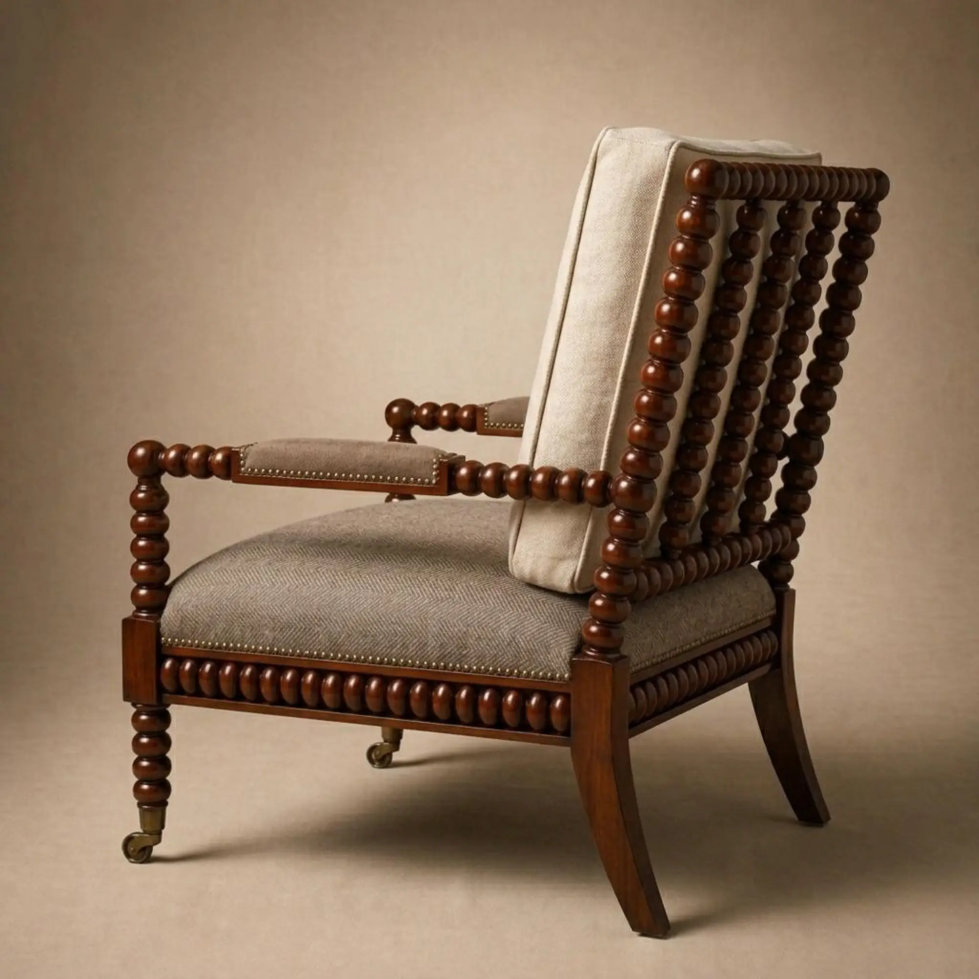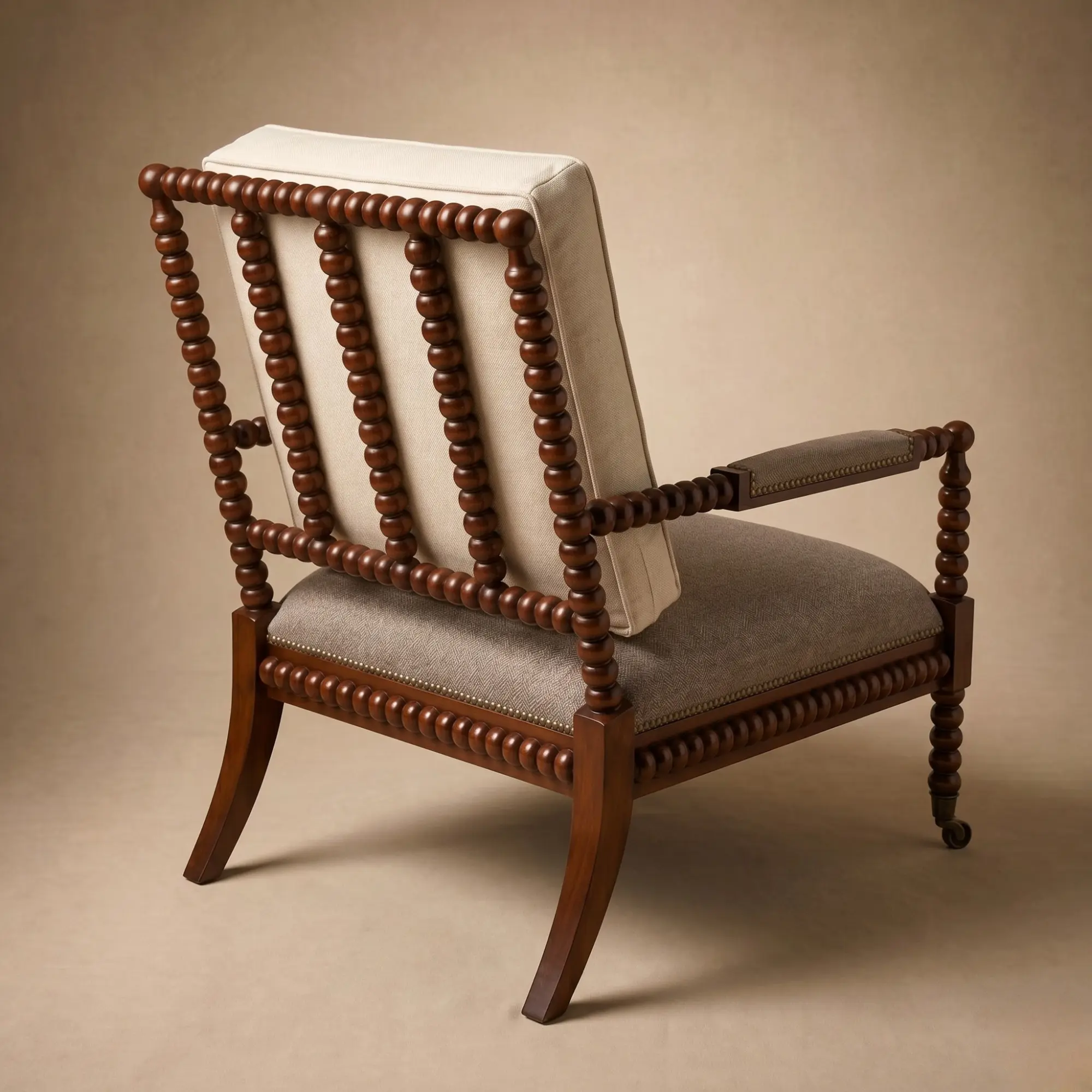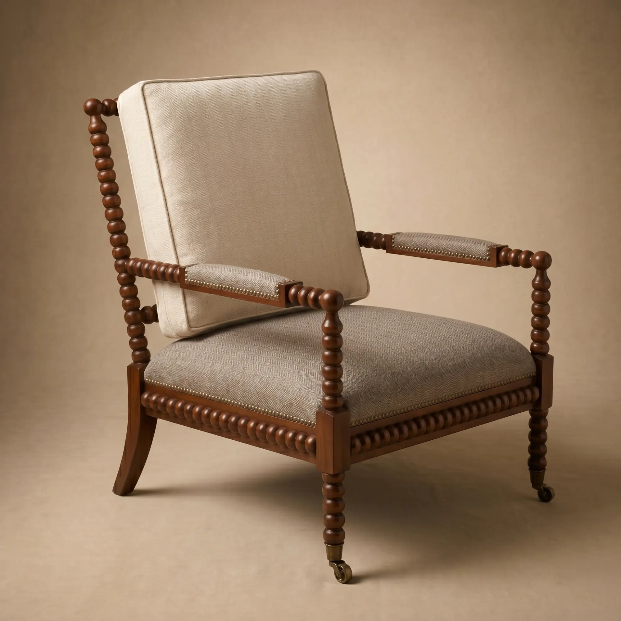 Solid mahogany · Hand-turned bobbin detailing · Upholstered seat and back · Front casters