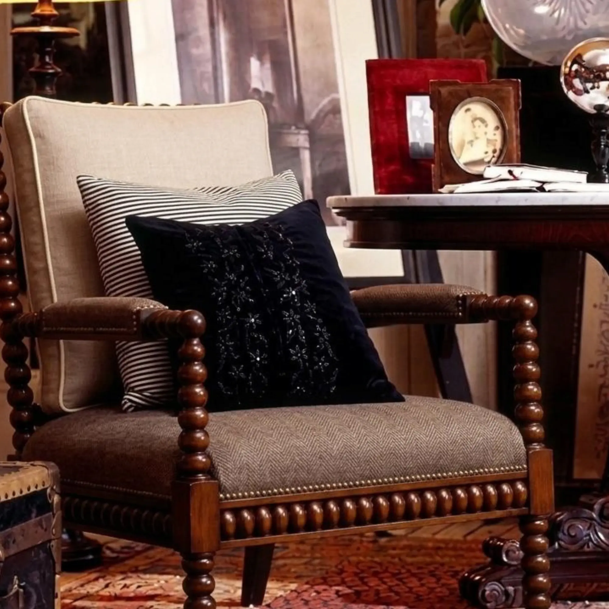 The bobbin lounge chair belongs to a tradition of seating where ornament is carried by structure itself. Its effect is not loudness, but rhythm. Repetition in the turned wood gives the frame character, while the restraint of the silhouette keeps it grounded.
