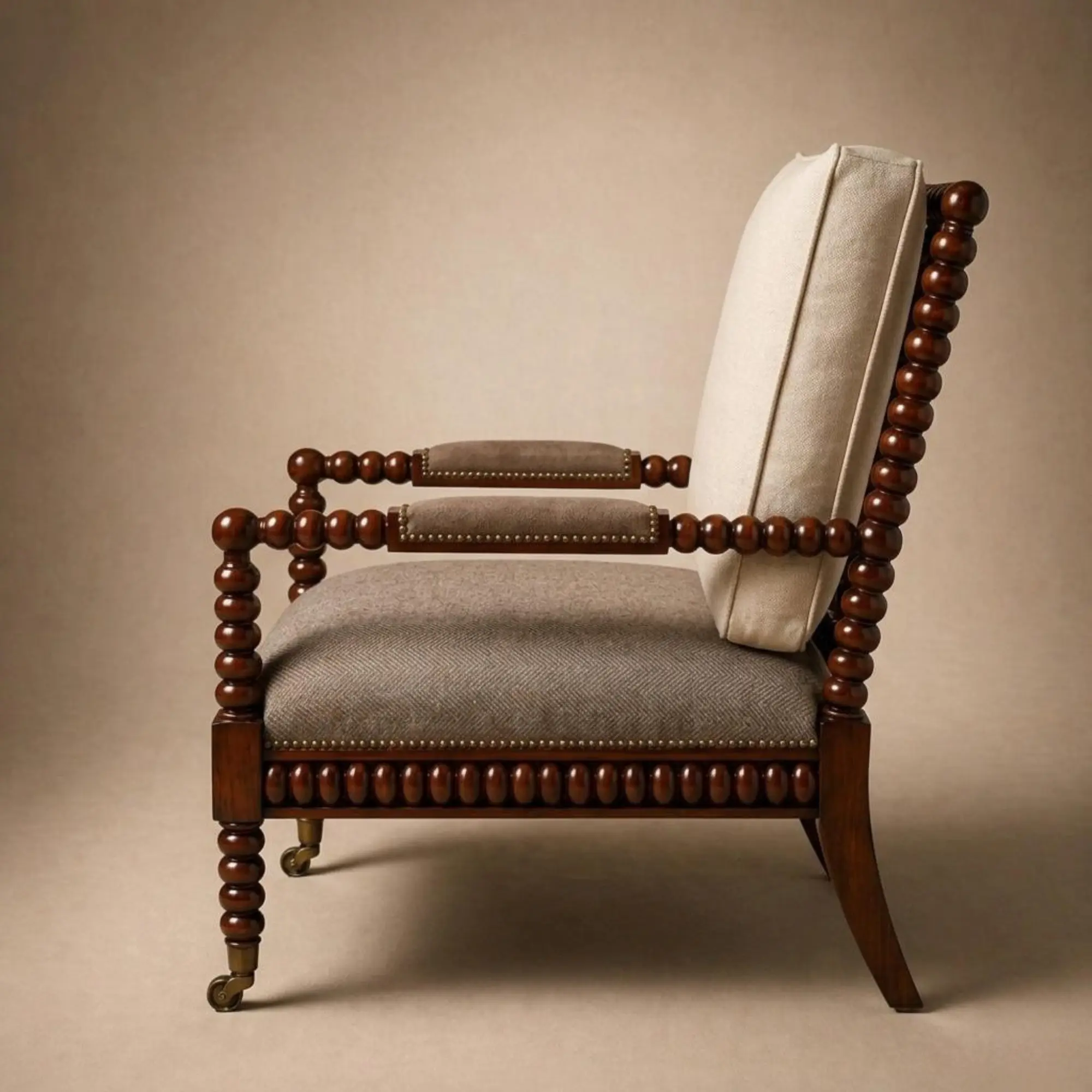 The Brompton Bobbin Lounge Chair is crafted in solid mahogany with hand-turned detailing that runs through the frame, arms, and apron with quiet precision. The upholstered seat and back balance the density of the wood, allowing comfort and structure to sit in proportion. Front casters lend ease without diminishing the chair’s sense of permanence.