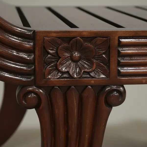 The Marlowe Ottoman Bench is a sculptural accent piece inspired by Indo-European design traditions. Handcrafted from solid teak with a rich, hand-applied finish, it features gracefully scrolled arms, fluted legs, and carved floral medallions that highlight the depth of the wood.