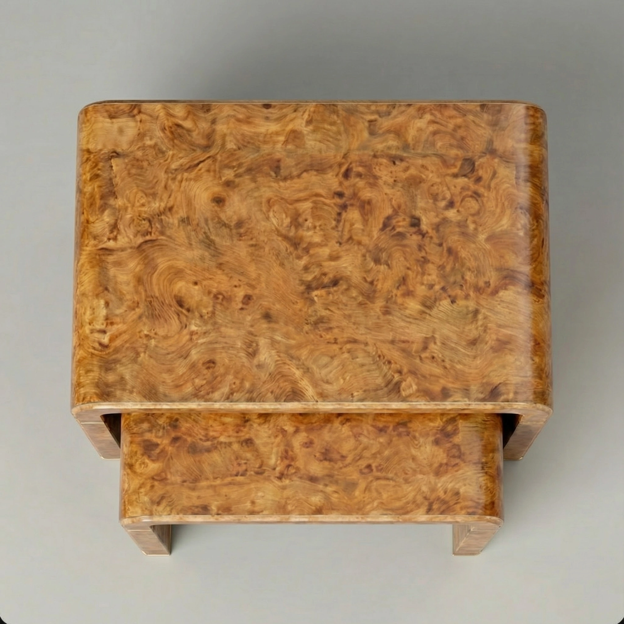 To achieve the seamless grain flow across the curve, the tables are constructed using hand-laid, book-matched archival veneers over a precision-engineered core. This is the correct standard for burl in waterfall construction, preserving the wood’s rare swirling figure while ensuring long-term structural stability and a clean, uninterrupted profile.