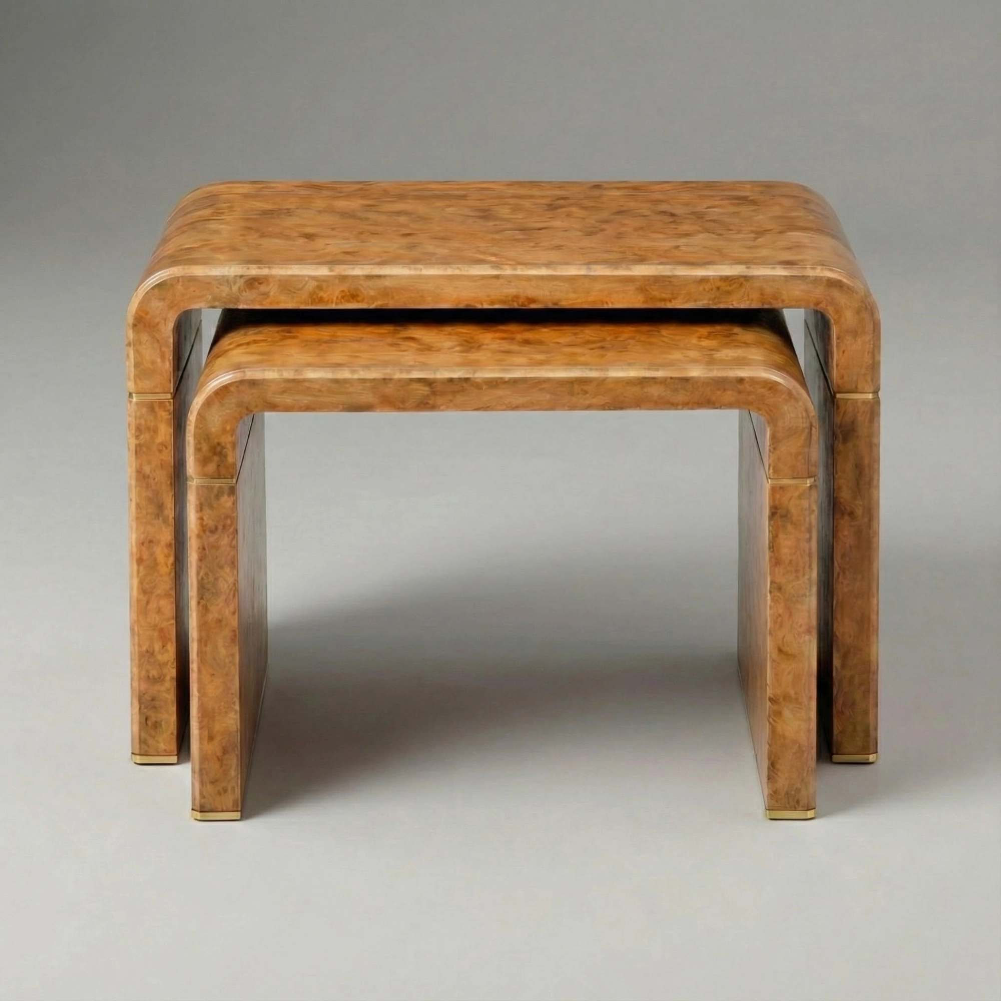 Designed to nest neatly when a quieter footprint is desired or to stand alone as individual end tables, each set displays natural variation in the burl. No two are exactly alike, yet every piece is unified by the same disciplined approach to proportion, material, and finish.