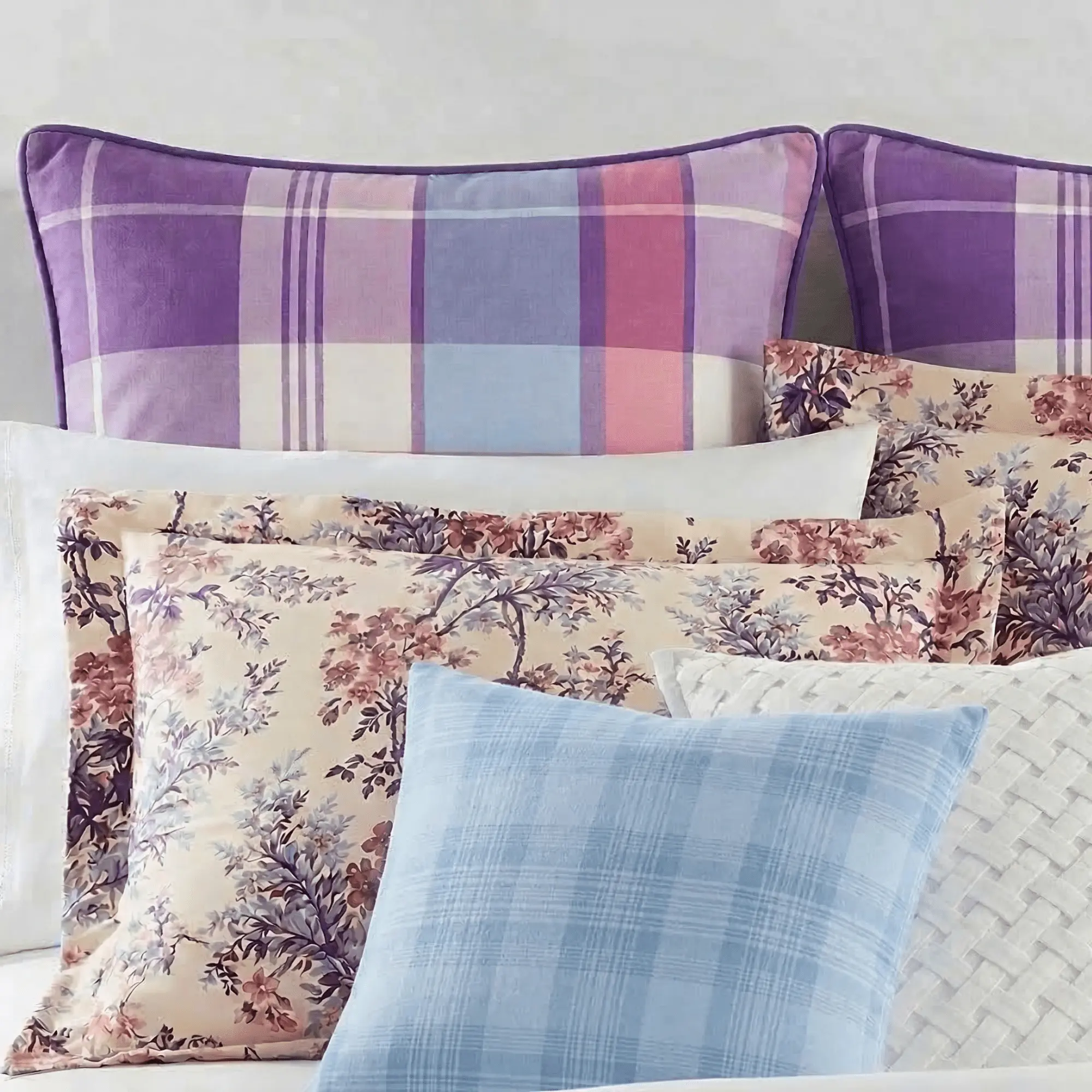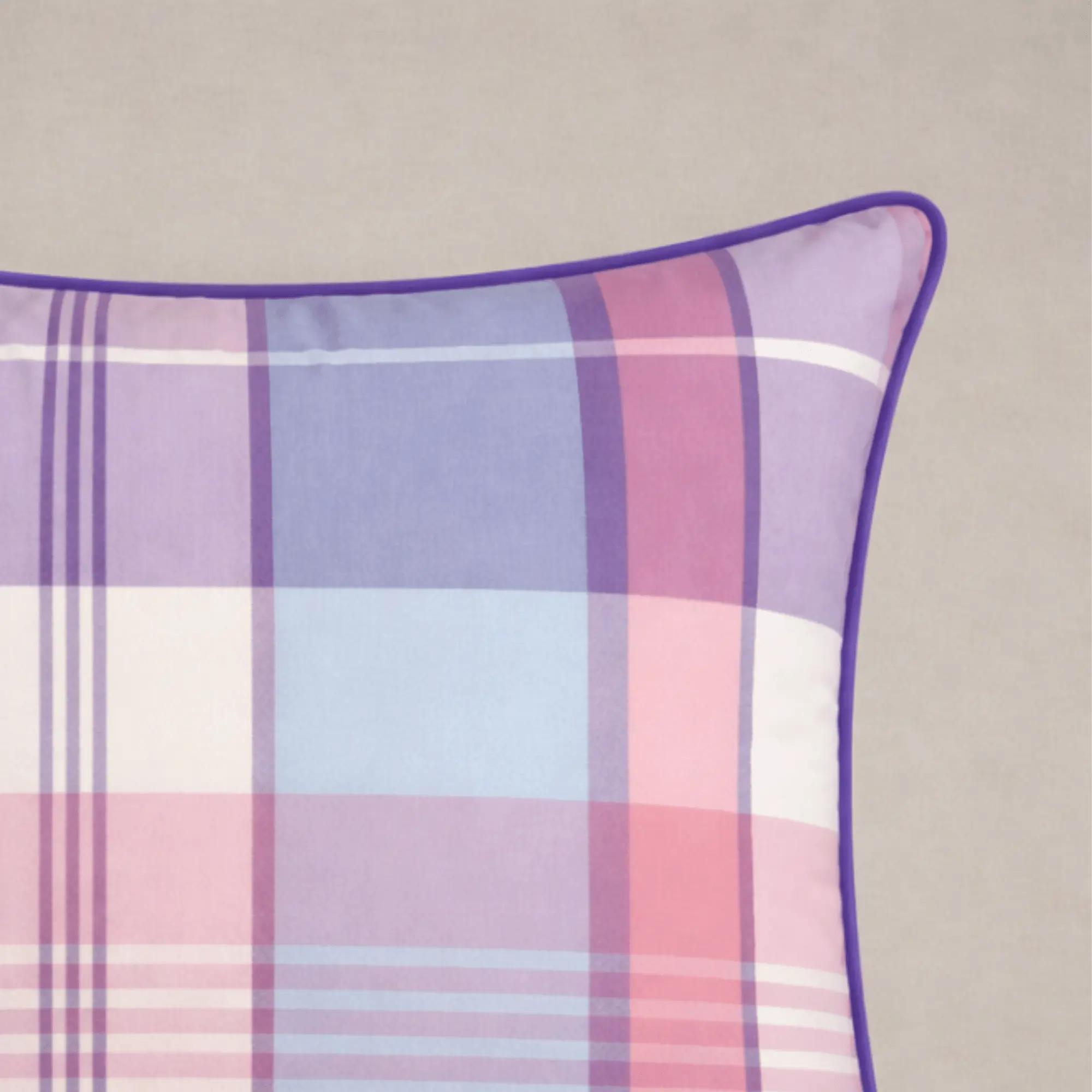 The Larkspur Plaid Pillow is defined by a softly structured plaid in layered tones of violet, lavender, blush, and pale blue. Rooted in classic textile tradition, the pattern is softened through a lighter palette that introduces color with restraint.