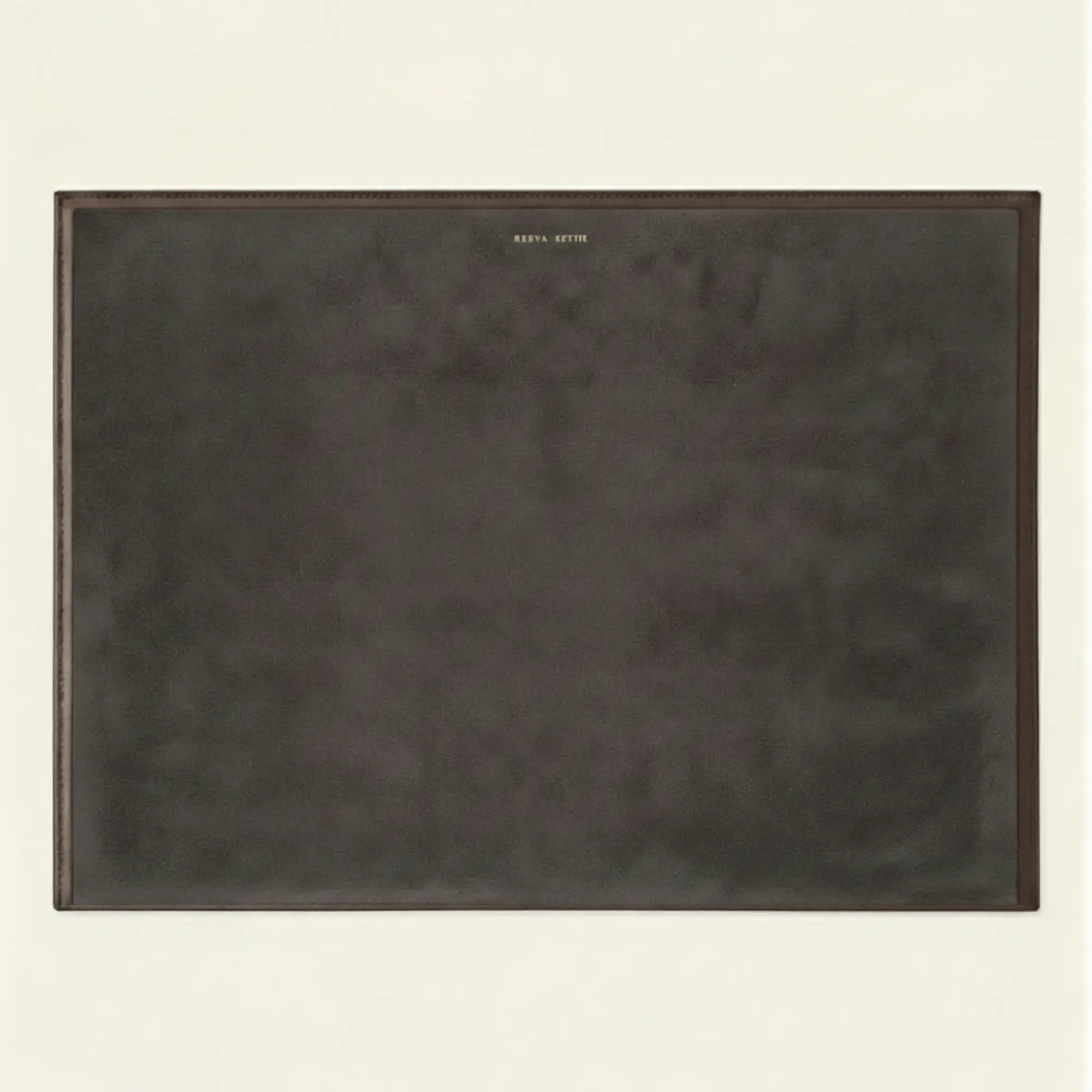 The Reeva Sethi stag emblem is debossed at the bottom right corner—a restrained mark of authorship. The reverse is finished with a soft suede backing, stamped with the Reeva Sethi name in understated gold.