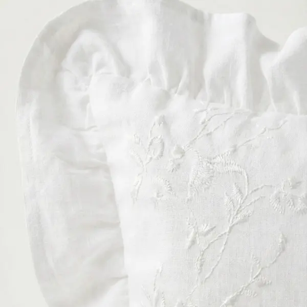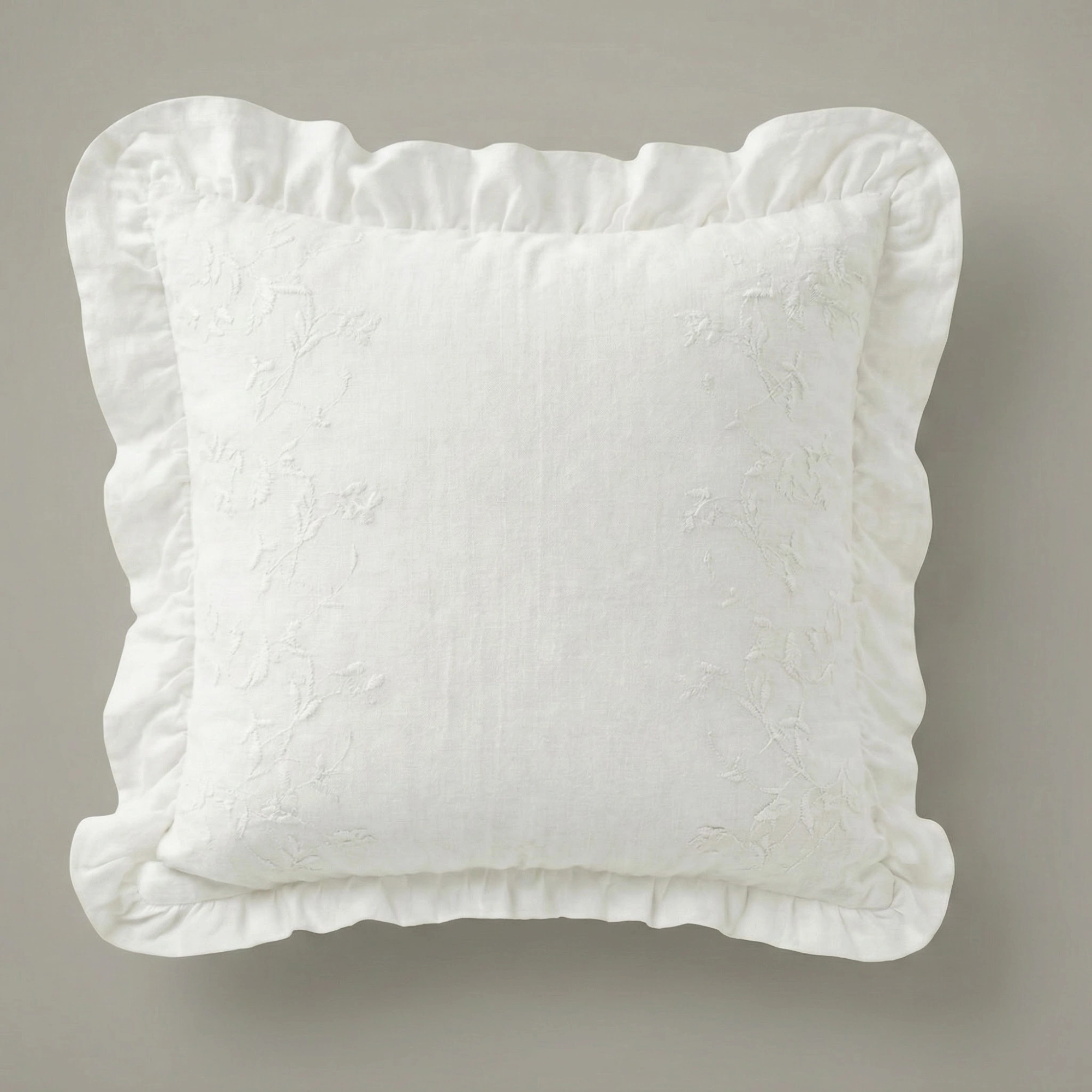 A gently gathered ruffle frames the silhouette, introducing softness without excess. This tailored finish lends the pillow an heirloom quality, balancing romance with restraint and allowing it to complement both classic and contemporary settings. The solid white reverse keeps the overall look clean and composed, making it easy to integrate into a variety of layered arrangements.