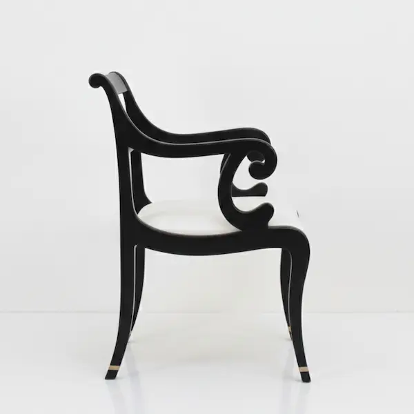 The gracefully curved ladder-back, sculpted saber legs, and elegant scroll arms create a neoclassical statement that feels both formal and inviting. A tight-upholstered neutral seat adds comfort without compromising the chair’s architecture, making this piece an ideal choice for formal dining spaces, studies, or as a standout accent in a refined living room.