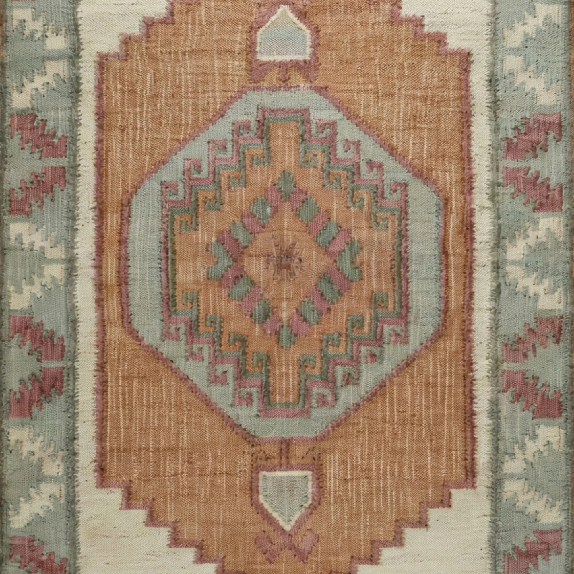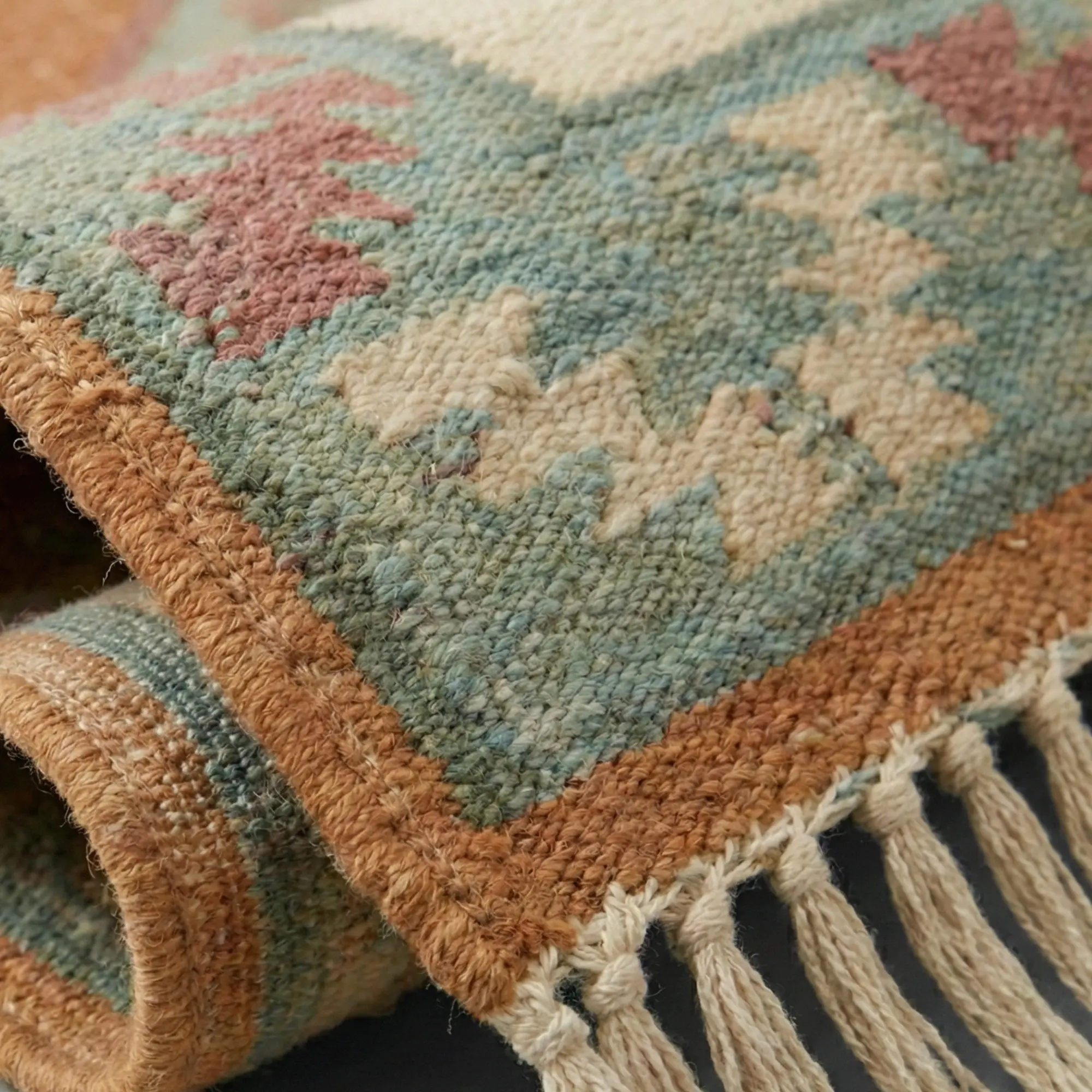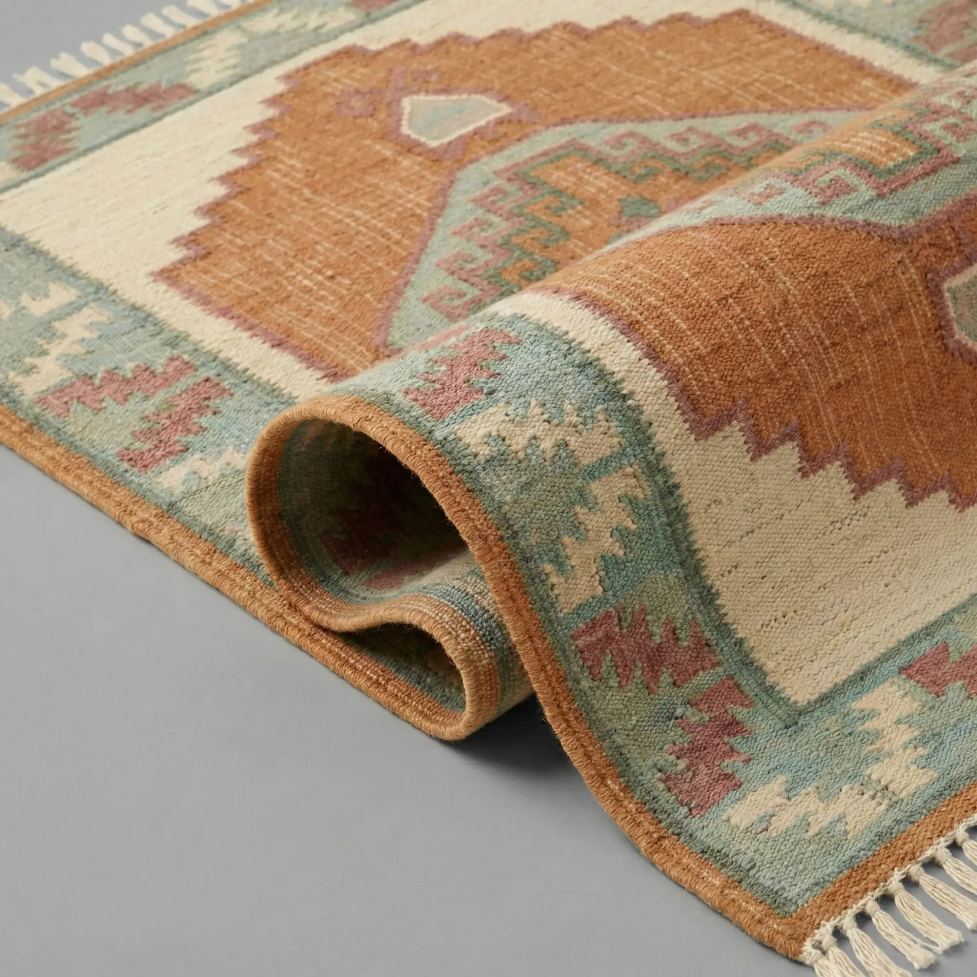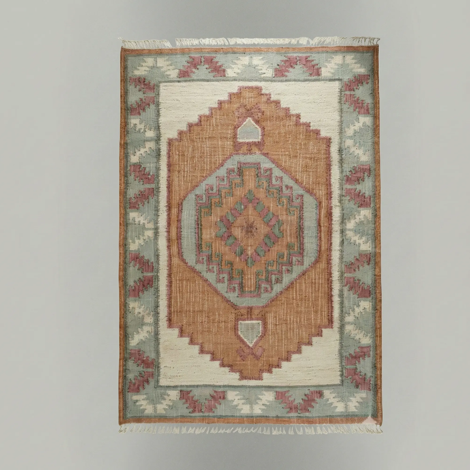 The Samarkand Medallion Rug brings quiet, collected pattern into the home with a grounded palette and a refined flatweave hand. Handwoven from natural jute and cotton, it features a central medallion framed by geometric motifs in warm terracotta, ivory, and muted sage tones, designed to read composed rather than busy.