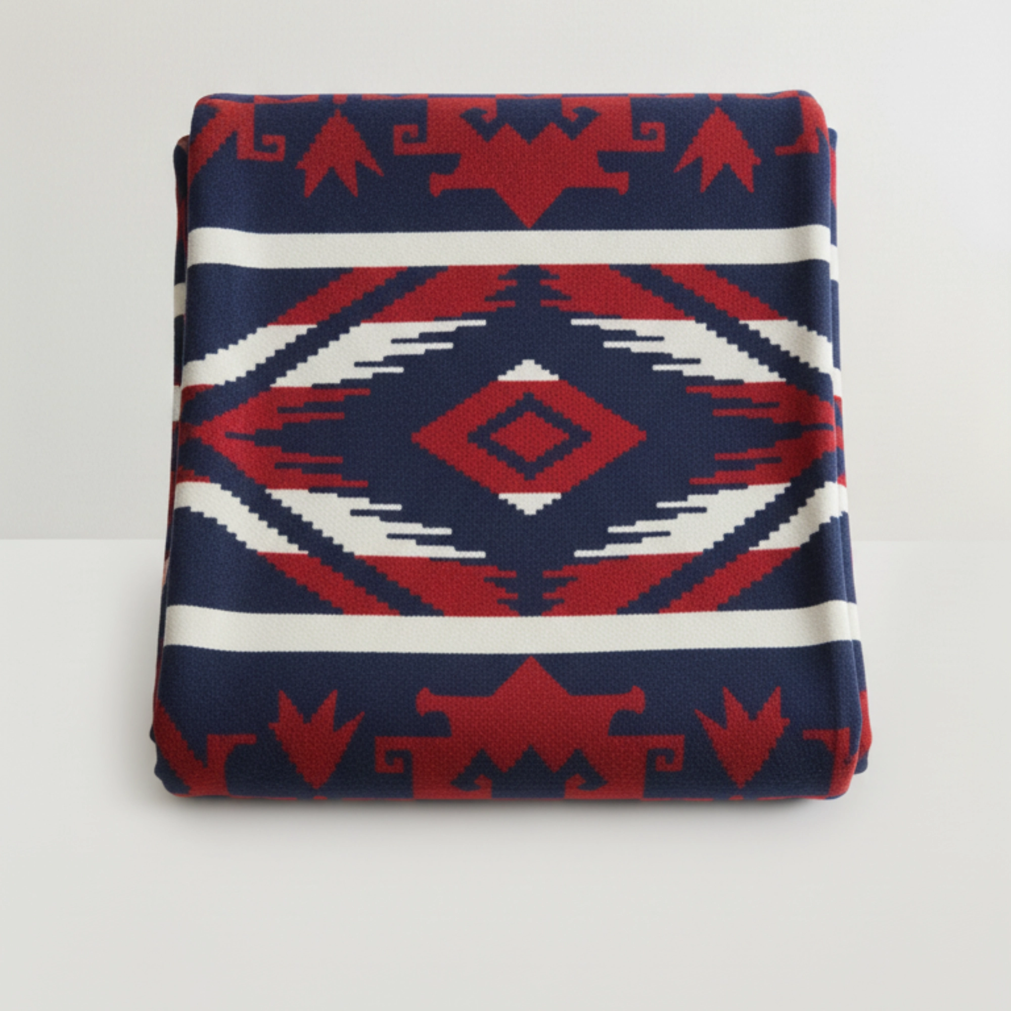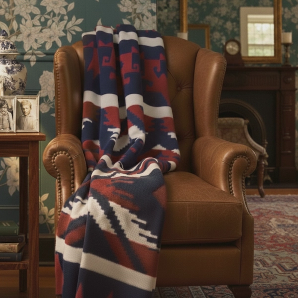 Graphic and grounded, the Santa Fe Lodge Throw sets a deep navy field against refined Bordeaux and ivory banding for a quietly bold statement. Woven in 100% cotton with a soft, brushed hand, it drapes with ease and reads as timeless—more lodge library than souvenir. Fully reversible and hemmed on all four sides, this medium-weight throw is sized for real living at 50″ × 70″. Layer it over leather, linen, or tartan to add color, warmth, and a sense of heritage.