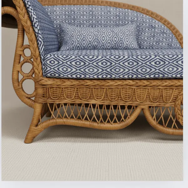 Timeless and elegant, the Savannah Wicker Chaise Lounge blends classic craftsmanship with modern comfort. Handwoven from high-quality rattan, it features an intricately detailed base, a gracefully curved backrest, and a rolled arm for a touch of vintage luxury. The plush, geometric-patterned cushions provide both style and relaxation, making it a perfect addition to any indoor or covered outdoor space.