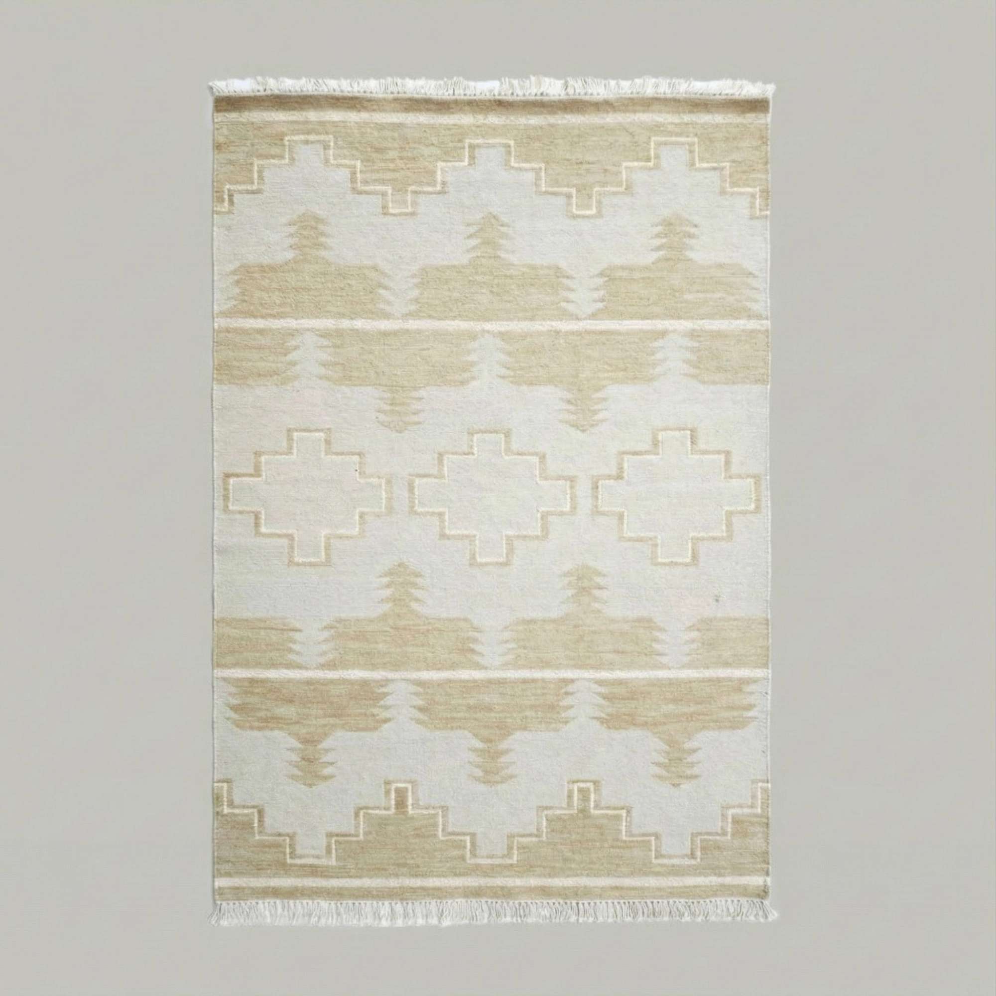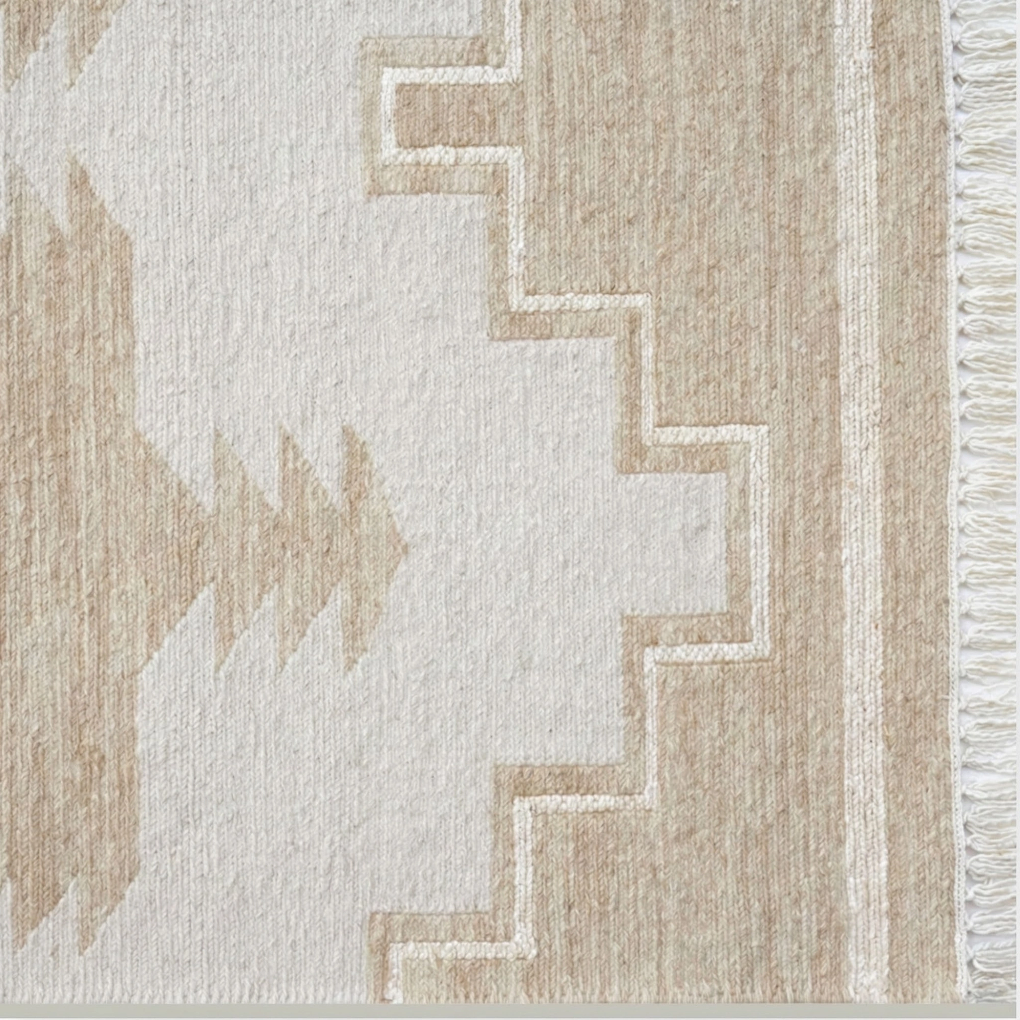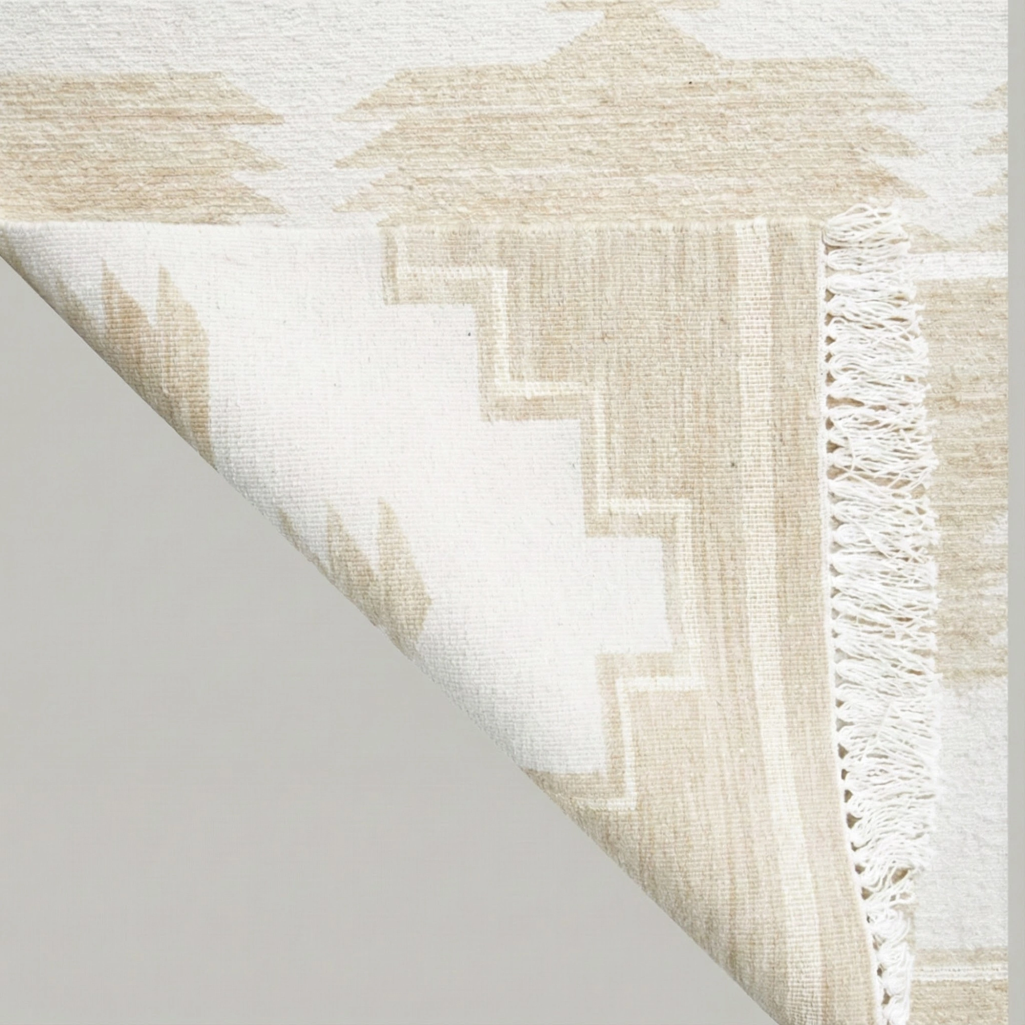 The Sierra Soumak Rug is a hand-woven flatweave designed for homes that value restraint, craft, and permanence. Woven in a grounded palette of sand and ivory with stepped geometric detailing, it brings quiet structure to a room without overwhelming the furnishings around it.