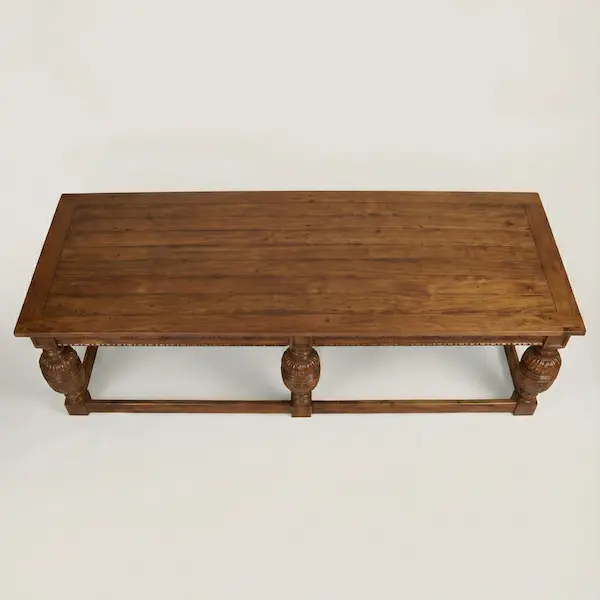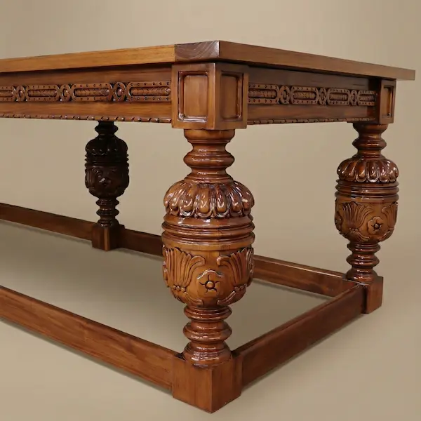 A commanding study in classical proportion, the Regent Refectory Table is defined by its expansive plank-style surface, deeply carved frieze apron, and sculptural turned pedestal supports. Crafted in solid hardwood, the table carries the weight and permanence of Old World refectory furnishings once reserved for grand halls and long communal gatherings.