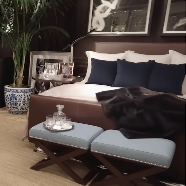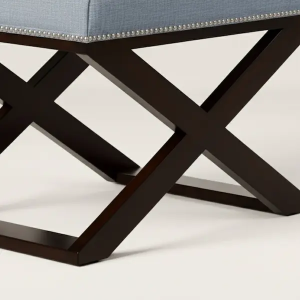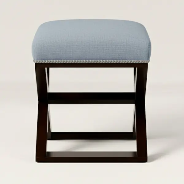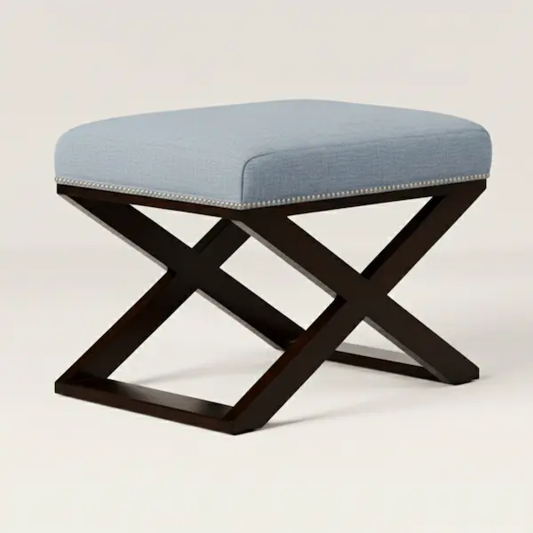 Evoking the ease of a Mediterranean seaside villa, the Riviera Cross-Braced Stool features a tailored upholstered seat paired with an architectural X-base crafted in solid mahogany. Finished with refined nailhead trim, this upholstered accent stool brings a sense of timeless craftsmanship and quiet luxury to refined interiors.