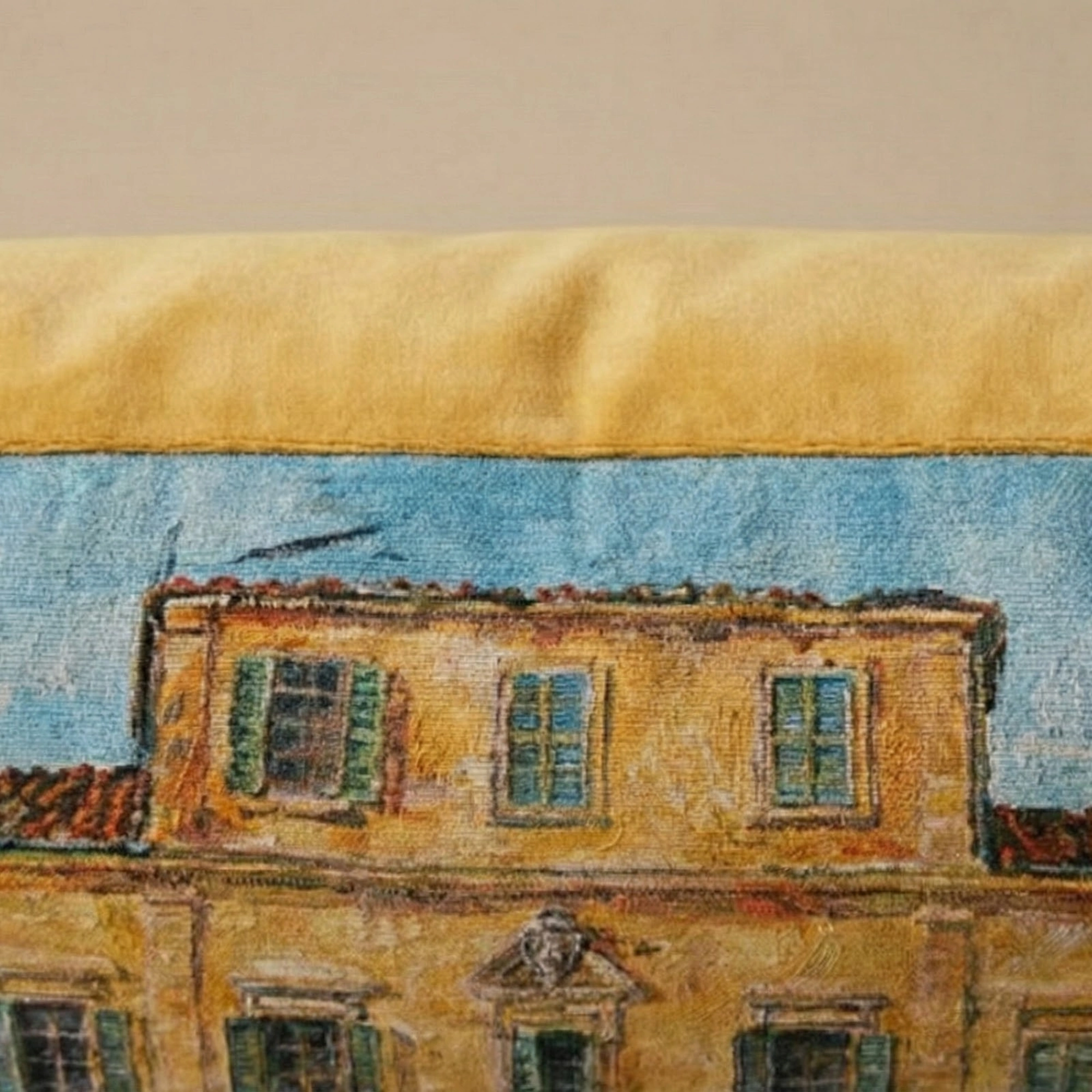 and cypress-lined paths. The balanced architecture and softly aged palette recall frescoed walls and slow afternoons, bringing a sense of old-world composure to layered interiors.An elegant nod to Mediterranean leisure, it settles naturally into both traditional and transitional settings, finished with a velvet reverse in a warm villa-gold tone for a quieter counterpoint.