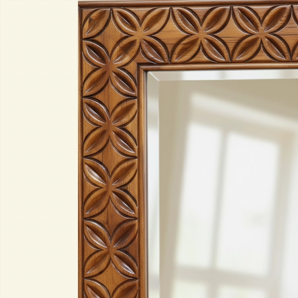 The Wexford Carved Rosette Mirror is an heirloom-quality accent defined by sculptural detail and timeless balance. Hand-carved from solid teak, its perimeter of dimensional rosettes lends architectural depth, warmth, and artisanal texture. A natural teak finish enhances the grain and subtle tonal variation, creating a refined presence that suits both classical and contemporary interiors.