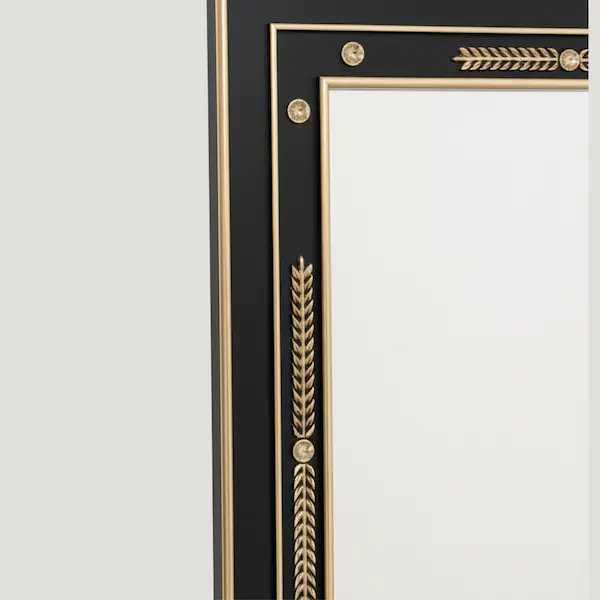 Evoking the stately charm of an English manor, the Windsor Regency Mirror embodies timeless Regency design. Its bold black–lacquered frame is elevated by hand-applied gold-leaf laurel detailing and rosette medallions, an ode to classical interiors.
